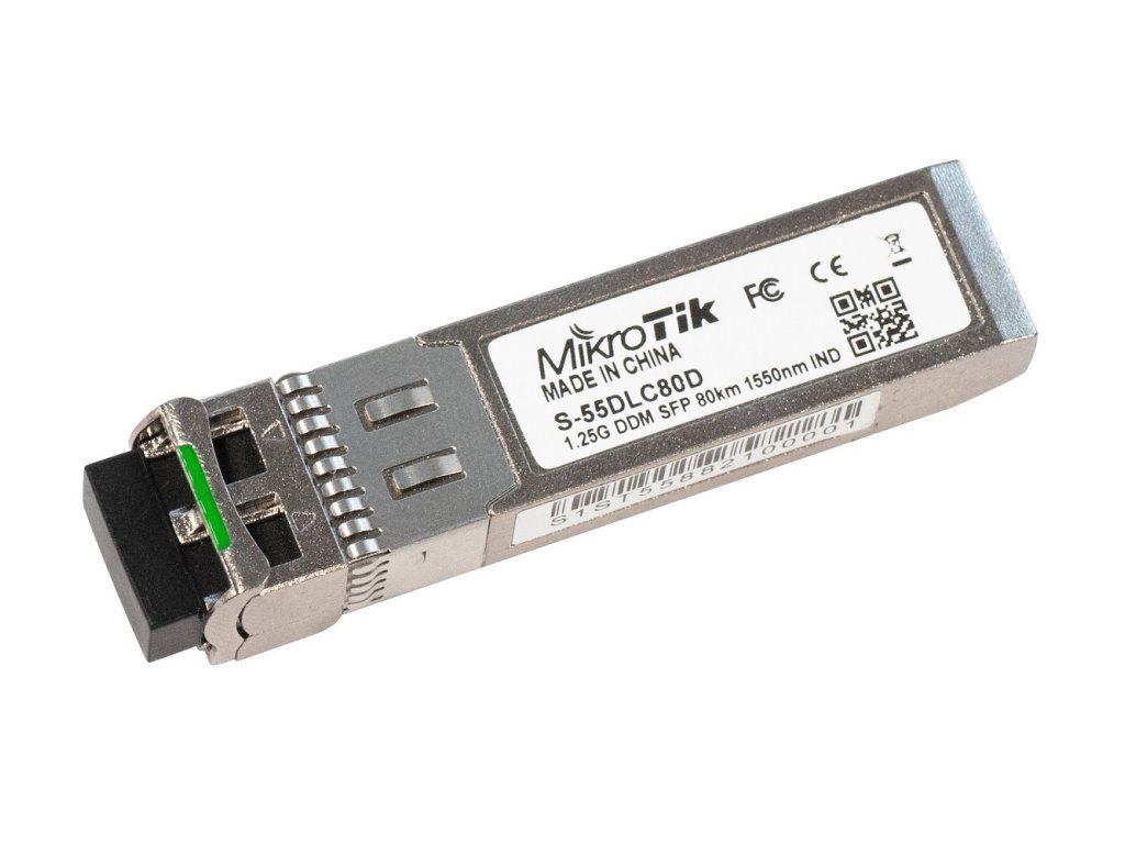 The S-55DLC80D is a singlemode Gigabit SFP module with a wavelength of 1550nm and two LC connectors for up to 80km. The module is compatible with all MikroTik active elements and also with other manufacturers' "cisco compatibile" devices.Additional parameters
