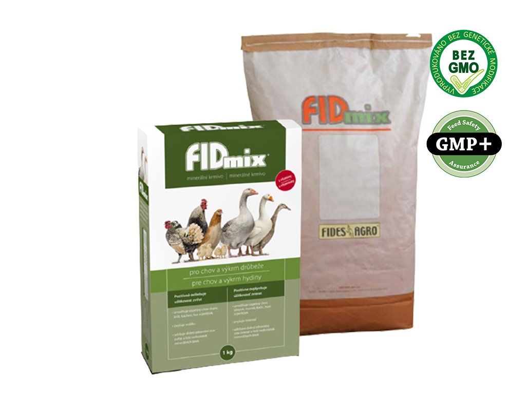 Mineral-vitamin feed withused daily, evenly mixed into the poultry's normal ration. Use a lower dose at the beginning of rearing or fattening and gradually increase according to the age of the poultry up to the upper recommended dose of FIDMIX feed, see table below. One full tablespoon contains approx. 30 g.