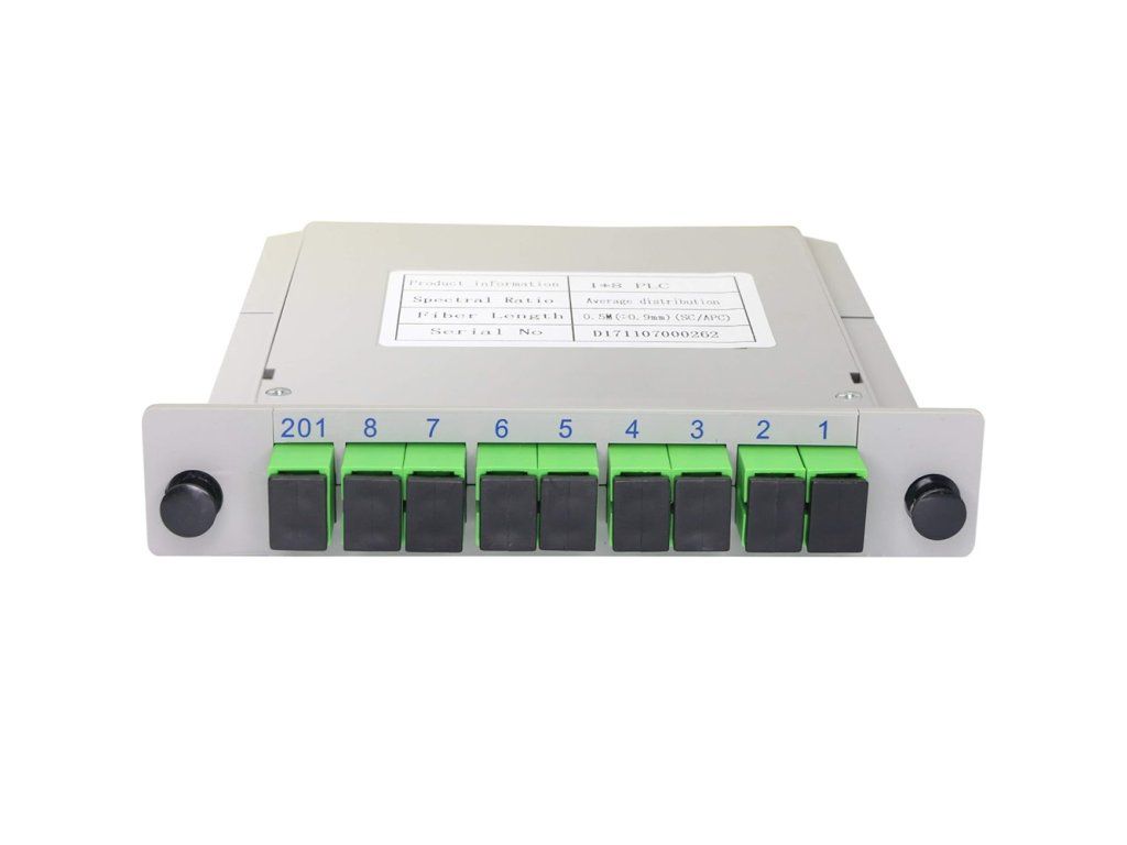 PLC Splitter 1X8 is characterized by small size, high reliability, wide operating wavelength range and good channel-to-channel uniformity, and PLC Splitter 1X8 is widely used in PON networks to realize optical signal power splitting. The product meets the requirements of GR-1209-CORE and GR-1221-CORE. PLC splitter (Planar Lightwave Circuit splitter) is a device used in optical communication networks to split optical signal into multiple branches. It is a passive device, which means it does not need power or electronic components to split the signal. PLC splitters are often used in a Passive Optical Network (PON), which is commonly used in telecommunications and broadband Internet access. The working principle of a PLC splitter is to split the optical signal using an integrated optical path on a silicon substrate. This path is created by a planar waveguide structure technique, which means that light waves are rectified and split into different branches or ports. Typically, PLC splitters are manufactured in the form of modules with a certain number of output ports, such as 1x2, 1x4, 1x8, 1x16, etc., where the first number indicates a single input path and the second number indicates the number of output ports. PLC splitters are cost-effective and offer low signal loss, which is important for maintaining the quality of data transmission in optical networks. They are widely used in optical access networks to distribute the signal from a single source to multiple receivers. Features Low insertion loss and low PDL Different coupling ratios High reliability and stability High channel count Wide wavelength range Parameters Splitting ratio: 1:8 Working wavelength (nm): 1260~1650 Fiber Type: G657A Insertion Loss (dB)(P/S Grade): 10.2/10.5 Loss uniformity (dB): 0.8 Return Loss (dB): 55 Polarization Dependent Loss (dB): 0.2 Directivity (dB): 55 Wavelength-dependent loss (dB): 0,3 Temperature stability (-40~85 °C) (dB): 0.4 Operating temperature (°C): -40~85 Storage temperature (°C): -40~85 Module dimensions (mm): 100×80×10Additional parameters