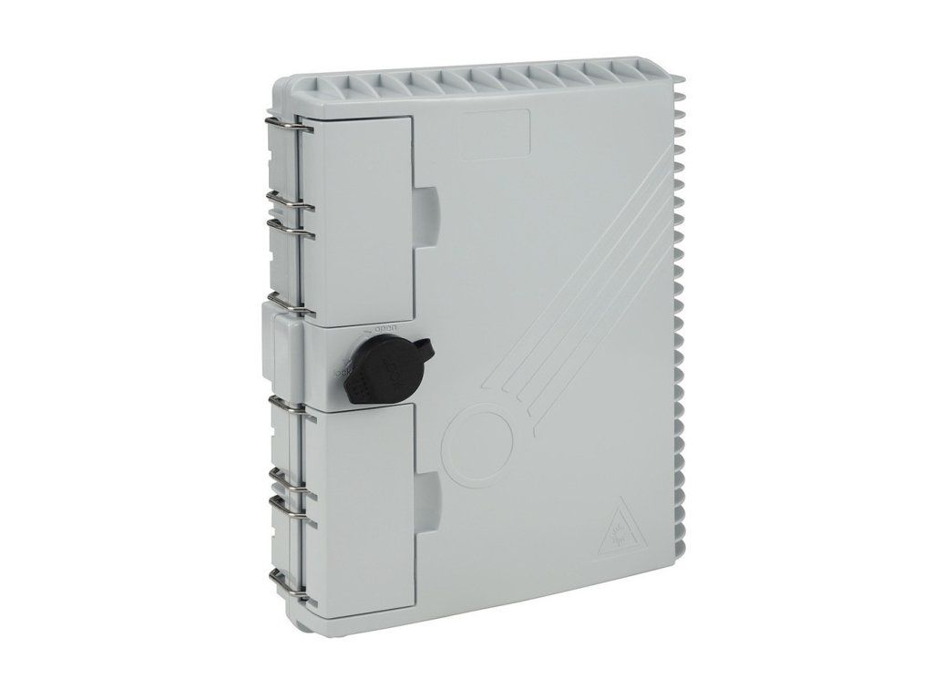 Universal wall mounted optical box for indoor and outdoor use. The optical wall box is used to terminate fiber optic cables in outdoor and indoor installations. This optical box is characterized by a high degree of protection IP65. The surface of the optical wall box is UV resistant. It can be mounted on a pole or directly on the wall using a mounting kit. The optical box allows termination of up to 16 fibers in a combination of 16xSC simplex or 16xLC duplex or 16xE2000 adapters. It includes 2x fiber optic cable entry with rubber cap in mid-span design, i.e. it is possible to terminate even a continuously installed cable without having to break all fibers in the cable harness. The output has 16 holes for patch cables, which are fitted with a rubber cover. When placing the optical patch cable into the box, the rubber cap must be cut lengthwise and pulled back together with the patch cable into the optical box opening. The optical box also includes a horizontal tilting bottom, providing easier handling when terminating and unloading pigtails. The box itself is lockable. Part of the package 10x tightening plastic tape 2x metal pull-tabs 4x screw 4x35mm 4x dowel 16x weld protection 60mm 1x plastic tube 4x550mm 2x wrench Technical parameters Coverage: IP65 Mounting method: wall/column Number of filaments to terminate: 16 Connector types to be fitted: 16xSC simplex Number of inputs for fiber optic cables: 2x18mm with rubber cap in mid-span design Number of outputs for fiber optic patch cables: 16x12mm with rubber cap Width: 240mm Depth: 110mm Height: 320mm Weight: 1.8kg Colour: RAL 7035 grey Operating temperature: -25°C to 70°CAdditional parameters