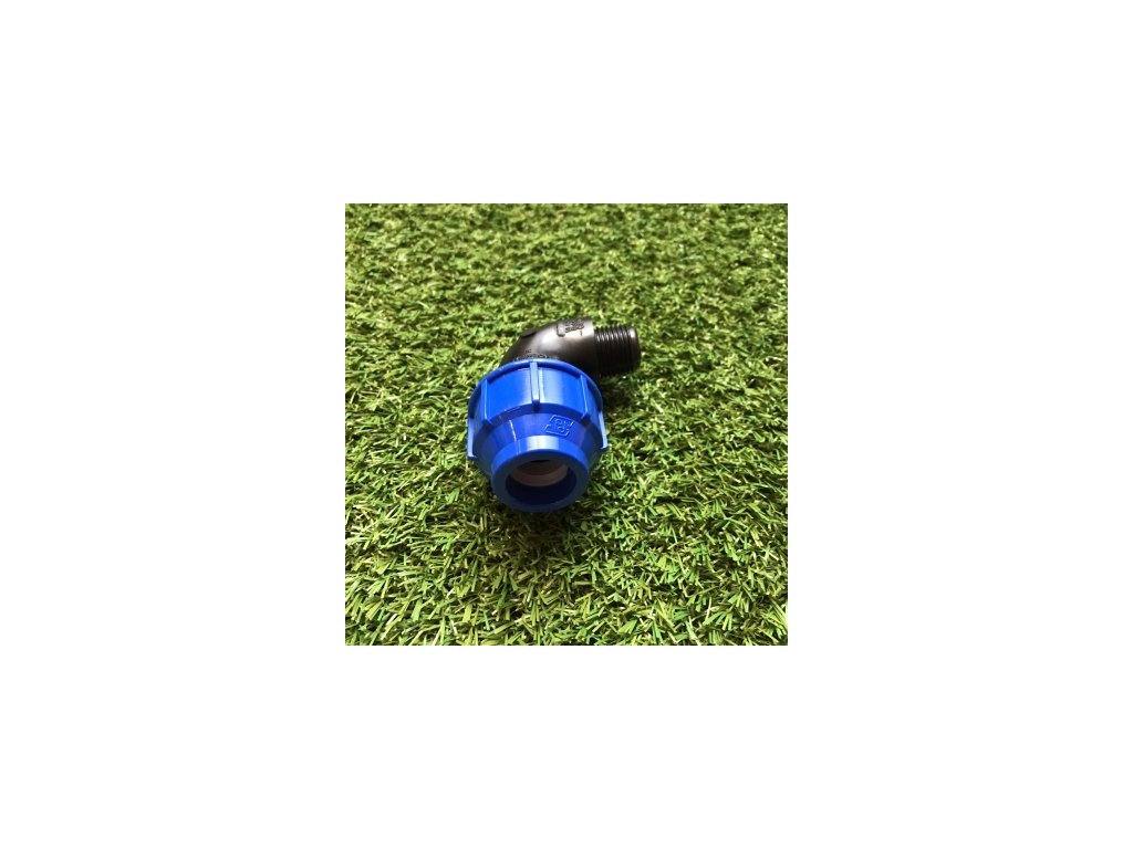 PP elbow Ø20mm with external thread 1/2", is designed for connecting PE pipes with various irrigation elements at 90° angle. This ensures easy and simple assembly of components and irrigation pipes with an outer diameter of 20mm.Additional parameters