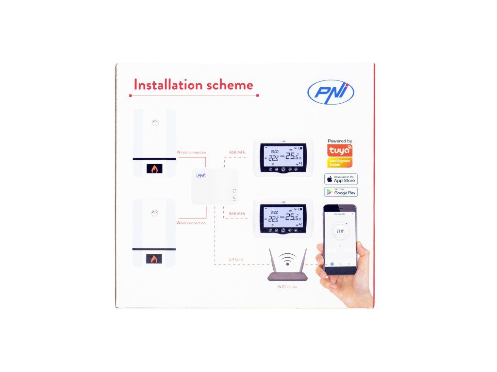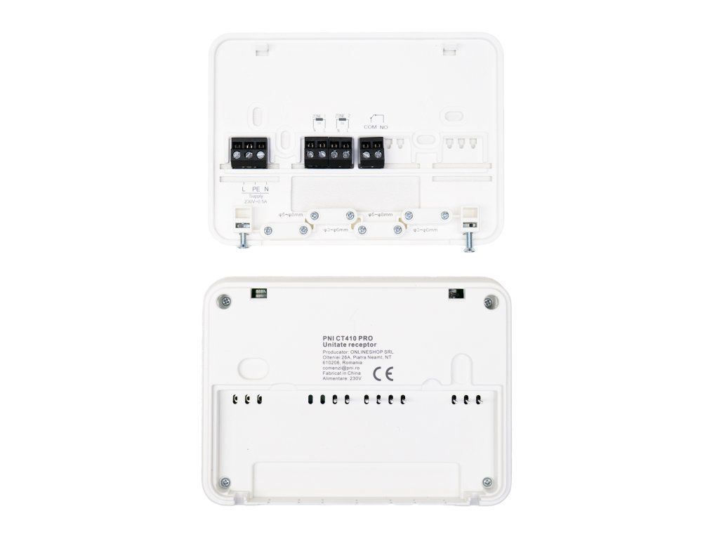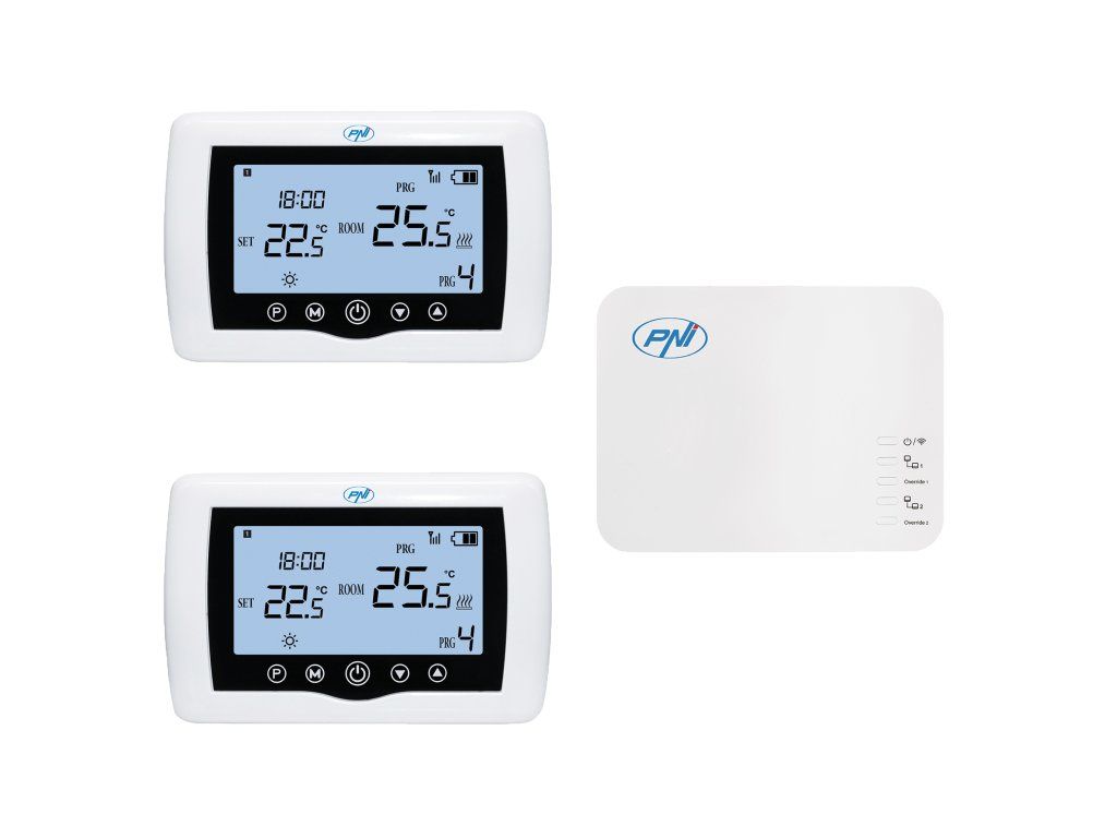 The PNI CT410 intelligent thermostat has been created to offer customers extra comfort at home, in the office or in other premises, offering the possibility to monitor and control the heating system, either automatically by scheduling on time periods every day of the week, or manually, remotely, anytime and from anywhere via the Internet and the dedicated Tuya Smart smartphone application (Android / iOS). The package includes two control units (transmitter) that allow temperature control and monitoring in two separate spaces. PNI CT410 is compatible with all thermal power plants with thermostat-compatible NO relay input without potential.