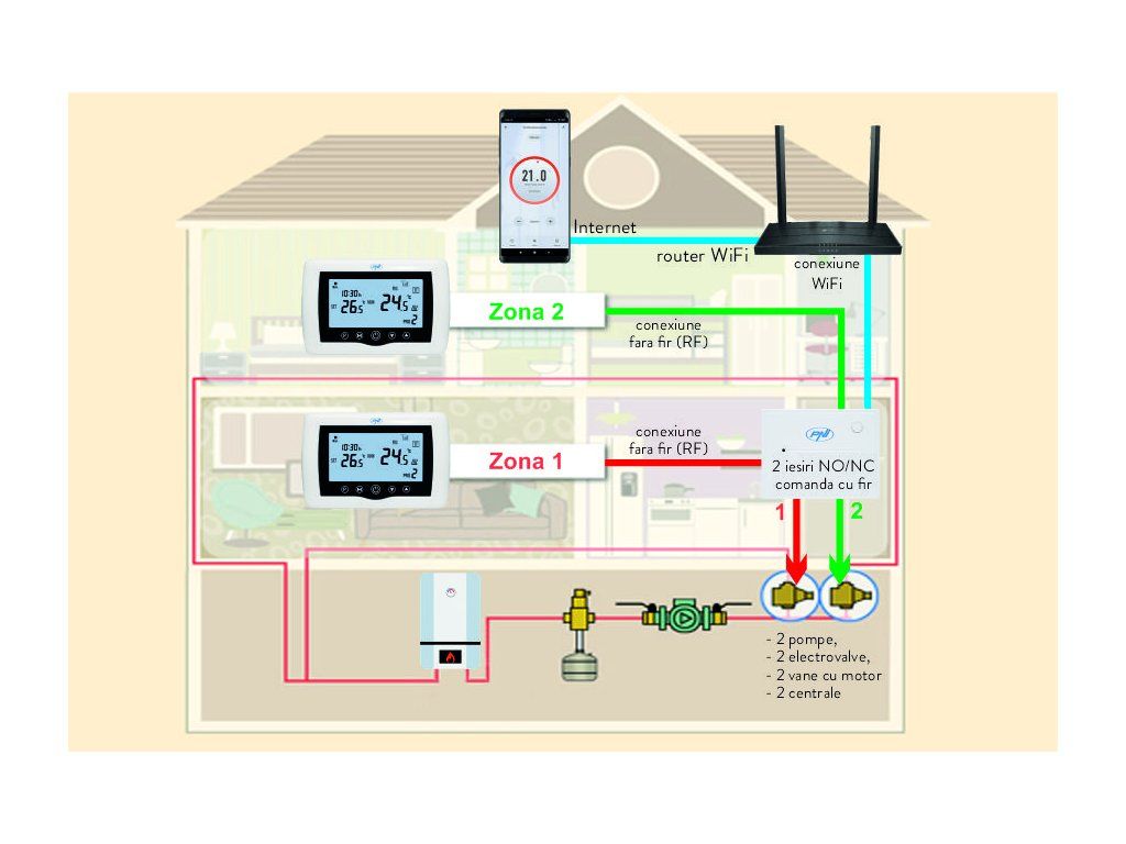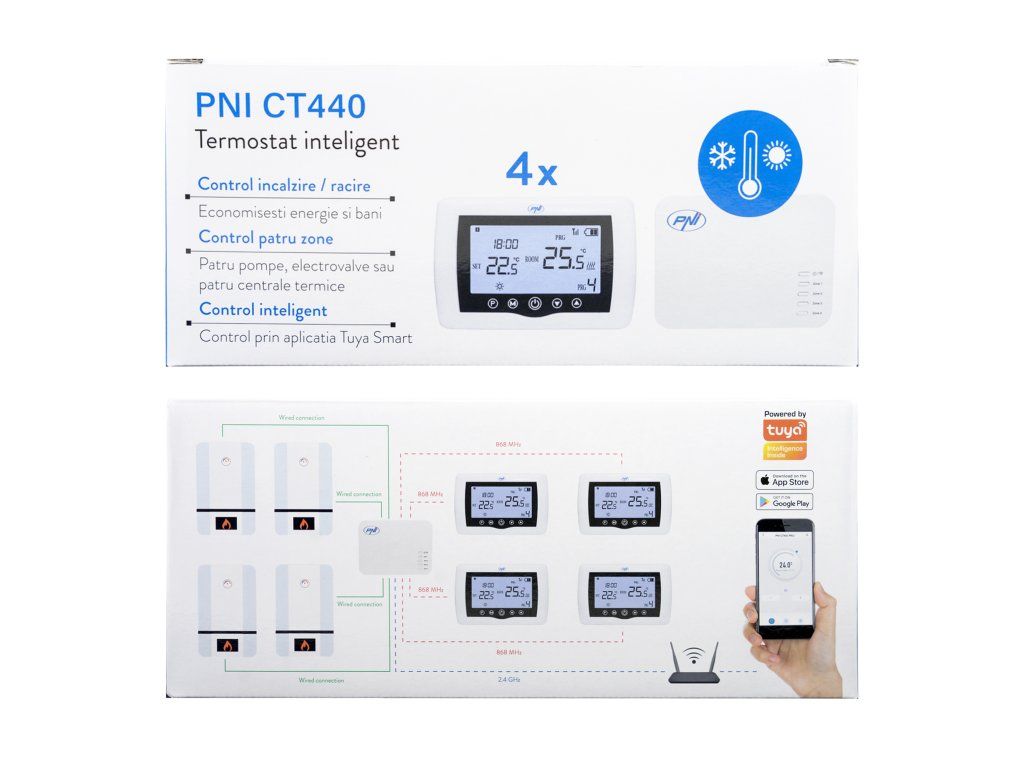 The PNI CT440 intelligent thermostat has been created to offer customers extra comfort at home, in the office or in other premises, offering the possibility to monitor and control the heating system, either automatically by scheduling on time periods every day of the week, or manually, remotely, anytime and from anywhere via the Internet and the dedicated Tuya Smart smartphone application (Android / iOS). The package includes two control units (transmitter) that allow temperature control and monitoring in two separate spaces. PNI CT440 is compatible with all thermal power plants with thermostat-compatible NO relay input without potential.