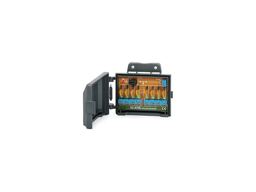 The LZ-8/POL is a passive device and allows power distribution. An undeniable advantage of using the LZ-8/POL in monitoring a system powered from a central location is the additional protection against interruptions. Without individual protection of each power line, an intruder can interrupt the power supply to the entire system by simply disrupting the lines of a single camera. Product Description: Name: LZ-8/POL Code: M1803 Number of outputs: 8 Number of inputs: 2 Input voltage: 0-24 VDC (typical 12 VDC) Maximum total current: 5.6 A Maximum output current (single output): 0.7 A Type of fuses: Polymer Input: 2.1/5.5 mm socket / connecting block Output: Connecting block Operating temperature/humidity range: -40°C ... 45°C / < 95% Dimensions (LxWxH): 120x60x35 mm Total weight: 0.065 kg Packaging : FoilAdditional parameters