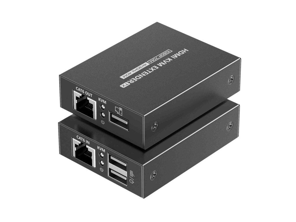 PremiumCord HDMI KVM extender 4K@30Hz and FULL HD 1080p at 70m with USB transmission, no delay Allows you to distribute a high-definition HDMI signal of FULL HD 1080p without delay up to 70m and transmit USB (e.g. keyboard, mouse) at the same time, allowing you to control your computer over a long distance using a mouse, keyboard and KVM monitor This HDMI Extender device allows you to transmit HDMI signal over long distances using CAT6/6A/7 network cable. By using a network cable, it is possible to achieve up to 70 meters of transmission length with FULL HD 1080p video resolution and transmit USB (e.g. keyboard, mouse) at the same time - HDMI extender up to 70 meters - The set includes a transmitter and receiver, which connect with a high quality Cat.6 / 6A / 7 cable - Supports 4K@30Hz resolution up to 40m and FULL HD 1080p (1920x1080) up to 70m - Video Resolution: 800x600, 1024x768, 1280x720, 1280x960, 1366x768, 1440x900, 1680x1050, 1920x1080, 480i@60Hz, 480p@60Hz, 576i@50Hz, 576p@50Hz, 720p@50/60Hz, 1080i@50/60Hz, 1080p@24/25/30/50/60Hz, 3840x2160@24/25/30Hz - Achieved maximum resolution: 4k@30Hz up to 40m and 1080P@60Hz up to 70m - Supports HDMI 1.4 and HDCP 1.4 - Supports HDR 10, YUV4:4:4. - Supported audio format:DTS, DTS-HD, PCL, LPCM Audio - Zero latency, no compression loss, no signal delay - HDMI signal can be transmitted up to 70m over Cat.6/6A/7 cable; up to 40m on Cat.5E cable - Connectors on the transmitter: HDMI input, HDMI output for local monitor, USB input, RJ45 connector for connection to the receiver, power connector - Connectors on the receiver: HDMI output, 2x USB output, RJ45 connector for connection to the transmitter, power connector - Lightning-proof, surge-proof and anti-static protection - Metal housing, stable and durable - Size: Width: 75 mm, Depth: 60 mm, Height: 20 mm - Weight: transmitter:123g receiver:125g - Operating temperature: -20~60°C - Storage temperature: -30~70°C - Relative humidity: 0 ~ 90% (non-condensing) - Lightning protection, surge protection, ESD protection. Package contents: 1x transmitter 1x receiver 2x 230V / 5V / 1A power supply 1x USB A-A male cable to connect the transmitter and PC 1x user manualAdditional parameters