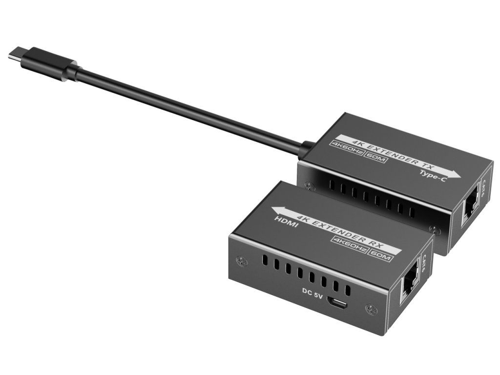 PremiumCord USB-C to HDMI extender over Cat5e/6/6a patch cable 4K@60Hz at 60m The most advanced chipset, it allows transmission of 4K@60Hz USB-C video signals up to 60 meters and 4K@120Hz signals up to 30 meters. Supports HDR10. The device allows high-resolution audio and video signals to be transmitted over a single network cable without delay and displayed on an HDMI monitor or projector over a distance of 60m. - The assembly consists of a TX transmitter and RX receiver, which are connected by a high quality Cat5e/6/6a patch cable. The transmitting device with USB-C connector displays a superior image on HDMI projector, monitor at a long distance. - Input USB-C or Thunderbolt 3 connector from computer, laptop or mobile phone, the USB-C connector is equipped with a short cable to avoid breaking out the USB-C connector - Supports 4K@60Hz at 60m and 4K@120Hz at 30m and FULL HD 1080p up to 60m when using high quality CAT6 UTP cable with AWG23 copper conductors - We recommend a quality Cat5e,Cat6,Cat7 UTP cable with copper conductors, preferably AWG23 for interconnection, does not need to be shielded - Resolution: 1280x720, 1280x960, 1366x768, 1440x900, 1680x1050, 1920x1080, 1920x1200, 720p@50/60Hz, 1080i@50/60Hz, 1080p@24/25/30/50/60/120Hz, 2560x1440@50/60/120/144Hz, 3840x2160@24/25/30/50/60/100/120Hz, 4096x2160@24/25/30/50/60/60Hz - Bitrate: 10.2Gbps - Supports HDR10 - Compatible with HDMI2.0 - Supports HDCP2.2, HDCP1.4 - Supports Audio formats LPCM, DTS-HD, DTS-Audio, Dolby Digital 5.1CH, Dolby Atmos - The transmitter and receiver connect to each other with a high quality CAT6/CAT5e cable.Both units have an RJ45 interconnect connector - The transmitter is powered from a USB-C connector and the receiver has a micro USB connector for power, one USB micro cable is included in the set for plugging into a USB on your computer or USB adapter - Operating temperature: 0-60°C - Dimensions: 67mm x 38mm x 21mm - Weight: TX 85g, RX 72g Package: 1x Transmitter unit 1x Receiver unit 1x manual 1x micro USB 5V power cableAdditional parameters