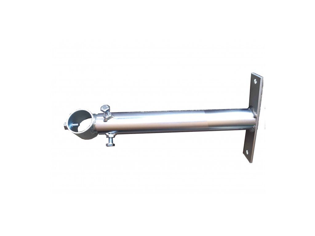 Pull-out bracket for 42 mm diameter mast with one mast locking screw and two locking screws to secure the pull-out section. Offset 410 to 470 mm from the wall or truss and rotatable. Product parameters: Offset: 410-470 mm Mast tube diameter: max. 42mm Base: dimensions 200x50x5mm, two-point attachment Surface finish: galvanic zinc Weight: 1,80kg Accessories: 3x hexagon bolt M10x20 Surface treated with galvanic zinc.Additional parameters