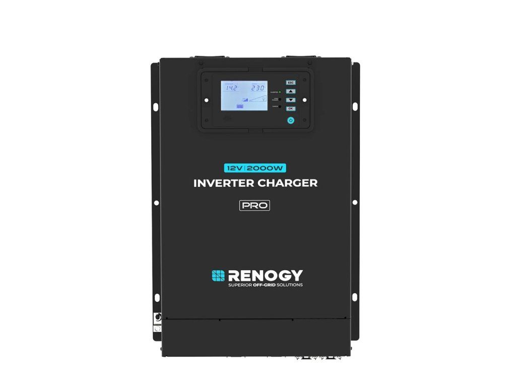 The Renogy Pro 12V 2000W HF inverter charger provides high efficiency and reliable power for off-grid and mobile applications. With an inverter efficiency of over 91% and standby power consumption below 10W, it helps extend battery life while minimizing energy waste. Its lightweight and compact design (8.1 kg) allows for easy installation in tight spaces such as RVs and small cabins. The unit features an innovative detachable control panel for convenient system monitoring and supports remote access via the Renogy app in conjunction with the optional BT-2 Bluetooth module (sold separately). A built-in current protector enhances user safety without the need for additional devices. It is compatible with a wide range of lithium and lead-acid batteries and supports AC input, offering a flexible and complete off-grid power solution. The inverter charger allows seamless switching between AC input and battery power within 20 milliseconds, ensuring uninterrupted operation of connected loads. Key Features: - Over 91% efficiency and standby power consumption below 10W for longer life - Weight 8.1 kg, compact size fits into tight spaces and easy to install - Removable panel and optional BT-2 module allow remote monitoring - Built-in current protector ensures safety without the need for additional modules - Supports lithium, lead-acid and AC batteries with fast switching Inverter specifications - Continuous power: 2000 W - Peak power: 4000 W - Output voltage: 230 V AC - Frequency: 50/60 Hz (± 0.1 Hz, default 50 Hz) - Output shape: pure sine wave - Efficiency: up to 91% - THD: < 4% - Input voltage: 12 V DC - Input voltage range: 10.5-15.5 V - No-load power consumption: < 10 W Charger parameters - Charging current: 5-120 A (adjustable in 5 A increments) - Efficiency: up to 85% - Input voltage: 187-265 V AC - Frequency: 40-70 Hz Other features - Automatic transfer switch (ATS): 16 A - Switching time: 20 ms max - Supported batteries: GEL, AGM, SLA, flooded (FLD), Ca/Ca, Li, user settings - Noise level: < 55 dB Operating conditions - Operating temperature: -20 °C to +50 °C (above 30 °C, performance may be reduced) - Storage temperature: -30 °C to +70 °C - Humidity: 0-95% Dimensions and weight - Dimensions: 432 × 305 × 124 mm - Weight: 7.9 kgAdditional parameters