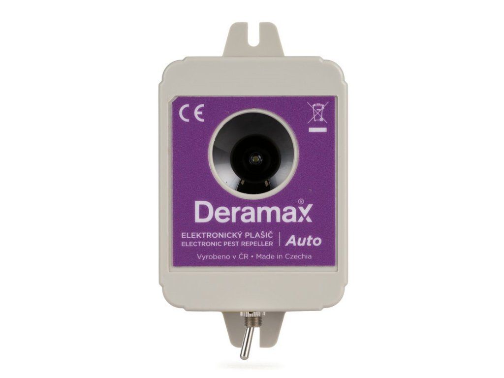 Top of the range pulsed ultrasonic scarecrow and rodent repeller for cars without the need to connect to the car battery! 12 months of operation on 9 V lithium battery. Czech product. Use of Deramax-Auto scarecrows Deramax-Auto is a marten and rodent scarer designed for car protection and helps to solve the problems caused by martens and mice in vehicles on wiring, cushions etc. The device is also commonly used to protect farm machinery, caravans, boats etc. The Deramax-Auto scarecrow generates strong ultrasonic pulses of a specific shape which are very unpleasant for martens and rodents, so that they leave the protected area after a short time. The marten or rodents in the car, caravan etc. are not killed or injured by the device, so there is no mortality and no need to remove dead animals. The operation of the device is environmentally friendly, completely chemical-free. Ultrasonic scarecrows and mice are nowadays quite a common method of protecting vehicles, and if you are faced with the problem of "how to deal with a marten in your car", the Deramax-Auto device is the optimal solution. Technical parameters: Power supply: 1pc 9 V battery (6LR61). Battery not included. Suitable batteries are shown as "Related items". Indoor and outdoor. The device is water and dust resistant. 91 dB. LAmax, effective value (TrueRMS). Power supply voltage: 9 V. Battery life: 1 year when using a lithium battery, 6 months when using an alkaline battery. Ambient temperature: - 20°C to + 90°C. Dimensions: 105 mm x 60 mm x 40 mm (with mounting brackets). Weight: 0.072 kg. Country of origin. Features of the Deramax-Auto scarecrow The Deramax-Auto scarecrow generates specific ultrasonic signals that are very unpleasant for martens, mice, rays, etc., so that they leave the protected area after a short time. Thanks to the sophisticated circuitry and the use of quality components, one 9 V battery will keep the device running for up to 12 months. At the same time, the device is completely self-sufficient in terms of power supply and therefore does not need to be connected to the car battery or otherwise powered from the car's electrical supply. This eliminates the need for professional installation and the possibility of losing the warranty on a new car due to the connection of a foreign device to the car's electrical wiring. There is also no risk of the battery being discharged when the vehicle is out of service for an extended period of time. Target pests: martens, rodents (including fleas), shrews. Scarecrow type: Ultrasonic (completely noiseless). Pulsed ultrasonic scarecrow. Built-in switch. No. No effect on pets. The Deramax-Auto scarecrow is powered by a standard 9 V battery. Therefore, there is no need to connect the scarecrow to a car battery and there is no risk of the car's electronics being disconnected and crashing, which can happen with some battery-powered scarecrows. Basic features of the Deramax-Auto scarecrow that distinguish it from similar products: High performance - Wide effective angle of attack - Safety - Water and dust resistant - Easy installation without connecting to the car battery Safety and comfort of operation of the Deramax-Auto scarecrow Deramax-Auto operates in the ultrasonic range, does not disturb its surroundings with annoying noise and is completely silent. This scarecrow of course meets the legal limits set for the maximum ultrasound level, but our internal rules go beyond the applicable laws and take into account current medical scientific work and the recommendations of international medical organizations in connection with the use of ultrasound signals, thus ensuring the complete safety of the users of this scarecrow. At the same time, this scarecrow and rodent scare has no negative effect on domestic or farm animals such as dogs, cats, horses, poultry, exotic birds, etc.Additional parameters