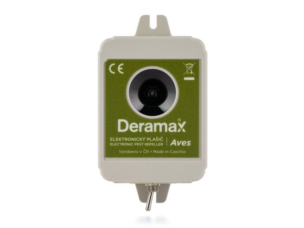 Subultrasonic scarecrow (repeller) Deramax-Aves. Protect your crops from birds with the effective Deramax AVES scarecrow. The Deramax-Aves is designed for use as a bird scarer (repeller). It generates specific sub-ultrasonic signals that are very unpleasant for birds, so that after a short time they leave the protected area and seek a new refuge outside the area protected by the scarecrow. In our conditions, the device is mainly used as a scarecrow for pigeons, starlings, sparrows, blackbirds, ravens, crows, woodpeckers, scarecrows, etc. The operation of the device is completely ecological without the use of chemical means. Main advantages of the Deramax AVES scarecrow scarer - efficient pulse operation - economical use of the battery - high power and range - resonant signal amplification - outdoor and indoor use - 60 months warranty Deramax-Aves is a product of the Czech company Deramax, which has been developing and manufacturing professional ultrasonic pest scarers since 2001. For over 20 years they have been improving their products based on the latest scientific knowledge and experience Features of the Deramax-Aves scarecrow Pulse operation of the battery powered scarecrow: One of the key advantages of the Deramax-Aves battery scarecrow is its optimized pulsed operation, which allows the generation of ultrasonic signals with very high sound pressure levels at minimum power consumption. The optimized pulsed operation of the scarecrow and thus the pulsed power consumption from the battery means several times higher efficiency of battery capacity utilization compared to conventional types of battery scarecrows. And this means a several-fold increase in battery life. Resonant amplification of the ultrasonic signal The Deramax-Aves scarecrow uses resonant signal amplification, which is important to achieve the highest possible performance with the lowest possible power consumption. We calibrate the frequencies generated by the scarecrow's electronic circuits with the resonant frequencies of the piezo transducers (ultrasonic "emitters") used in each production run. Power supply of the Deramax-Aves: The Deramax-Aves is a battery powered scarecrow using a standard 9 V battery. We recommend using a 9 V lithium battery, which will keep the unit running for 12 months. A standard 9 volt alkaline battery will keep the scarecrow running for 6 months. Pest target: pigeons, starlings, sparrows, blackbirds, blackbirds, crows, crows, woodpeckers, scarecrows, etc. Resistance of the scarecrow: Indoor and outdoor use. The scarecrow is resistant to water, snow, moisture, dust, high temperature and frost (- 25°C to + 80°C). Deramax-Aves scarecrow safety: The scarecrow generates a signal in the sub-ultrasonic region (high frequency noise region). In terms of its effect on humans, the Deramax-Aves does not disturb its surroundings with annoying noise and meets the legal limits set for the maximum level of high-frequency noise and ultrasound. Effect on pets and livestock: This scarecrow (repeller) also has a negative effect on domestic cats and dogs within its effective range. However, there is no need to take any special measures with regard to domestic animals. It is sufficient if the pet is allowed to leave the area protected by the device freely. The repeller will therefore not harm your pet, it will just avoid the area. However, always ensure that the pet has the opportunity to leave the protected area and never use this type of scarecrow against an animal confined in a pen etc. Comfort of operation The device does not need to be adjusted in any way, it operates completely automatically. Just insert the battery and turn on the built-in switch. Location of the scarecrow A common solution for the placement of the scarecrow and usually the most practical solution, especially for indoor use, is to place it on the ground in one of the corners of the protected area with the front part directed towards the centre of the protected area. However, it is also possible to fix the scarecrow with screws or double-sided adhesive tape to a fence, wall, post, window, door, etc., which is most suitable for outdoor use. Again, we recommend directing the front of the scarecrow to the centre of the protected area. For more information on suitable placement, please visit All about pest scarers Efficiency range of Deramax-Aves The maximum effective distance in front of the scarecrow is up to 14 metres. The effective area range is up to 120 m2. The effective angle of attack is 120 degrees. The scarecrow therefore has a high power output and the special design of the device ensures a wide effective angle of attack of 120 degrees, while even at the limit of the declared angle of attack (i.e. outside the main direction of the signal) the scarecrow still generates at least 83% of the declared sound pressure level. Of course, the ultrasonic signal also propagates beyond the stated 120 degree angle of incidence, but the efficiency here is already less and therefore, for the sake of objectivity, we give an effective angle of incidence of "only" 120 degrees. Deramax AVES bird scarer Can more than one scarecrow be used in the same area? Any number of ultrasonic scarecrows can be placed in one place and their signals do not interfere with each other. On the contrary, it is common to use multiple scarecrows to protect especially larger or more rugged areas, because a larger number of scarecrows (repellers) installed in one location means significantly higher penetration of the protected area by the ultrasonic signal and increases the overall efficiency. Technical data: Scarecrow type: Pulsed subultrasonic scarecrow. Noiseless to humans. Power: 9 V battery (6LR61). This is a 1pc common 9 V battery, so called "nine". Battery not included. Battery life: 1 year when using a lithium battery, 6 months when using an alkaline battery. Indoor and outdoor use. Scarecrow is water, snow, moisture, dust, high temperature and freeze resistant. Effec