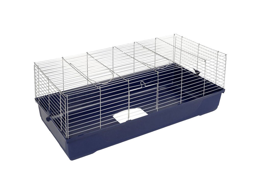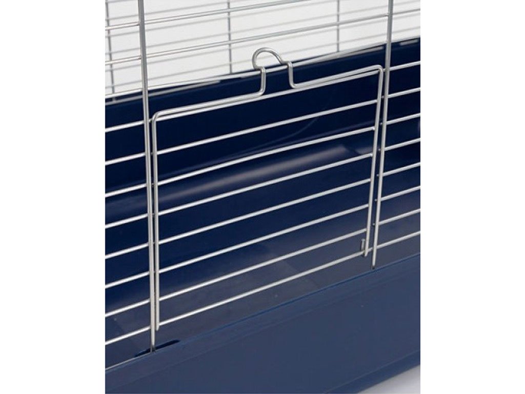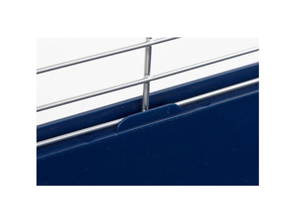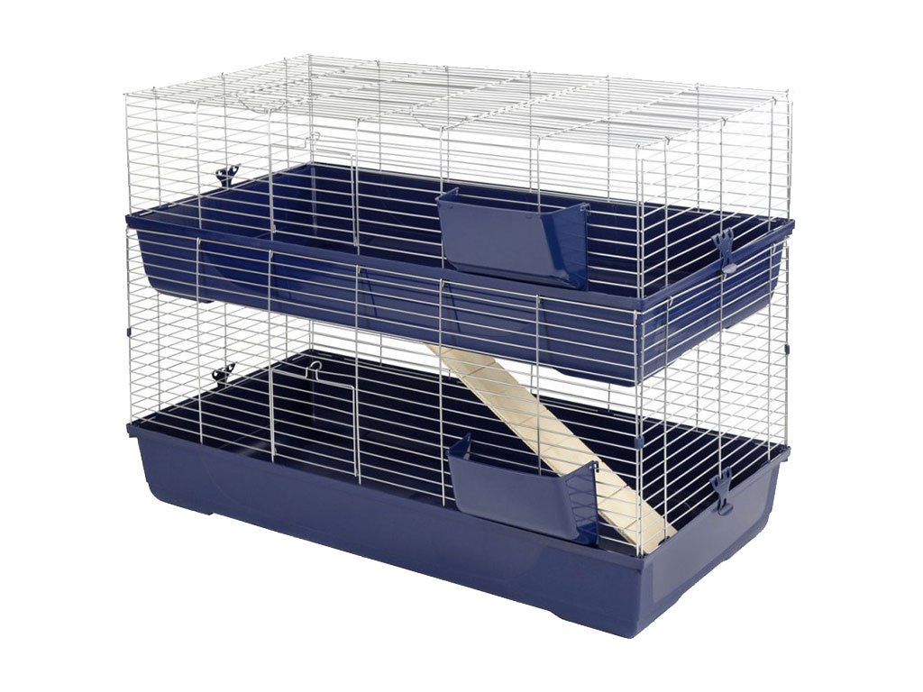 Dvojposchodová klietka pre hlodavce, vhodná pre králiky, morčatá, činčily a iné, priechodná cez drevený rebrík, konštrukcia so zasúvacím systémom, predné dvierka na každom poschodí, horné dvierka na hornom poschodí, dve kŕmidlá súčasťou balenia, farba tmavo modrá, rozteč mreží 2,2cm, rozmery klietky 120x53x86cm.