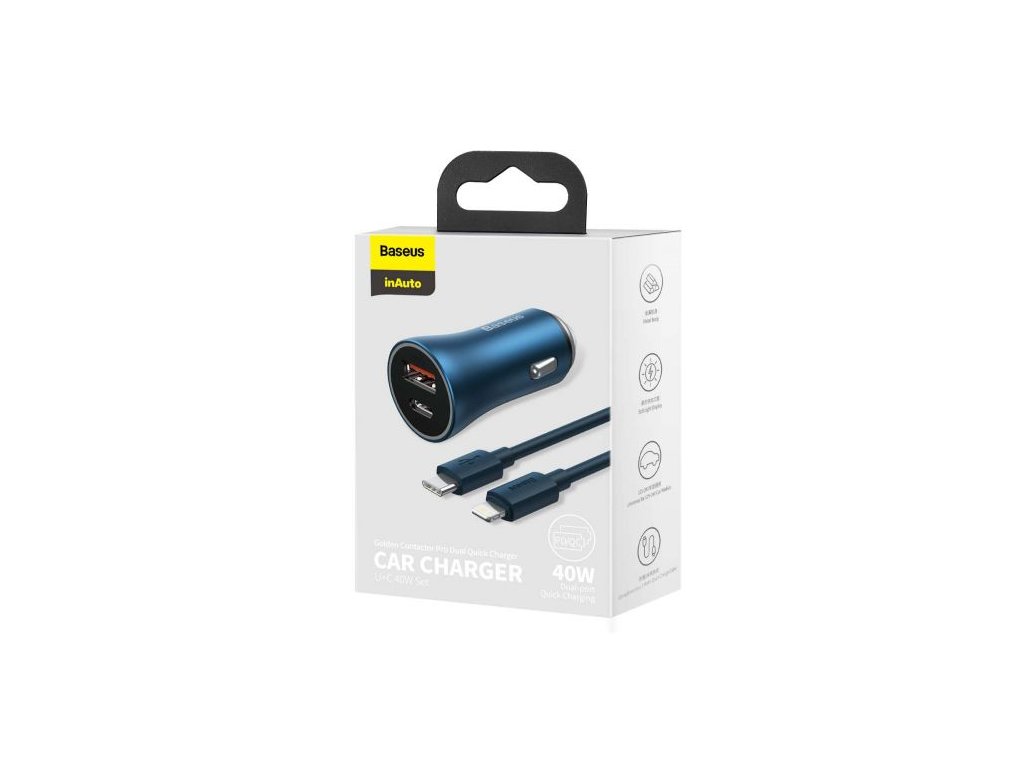 Baseus Car Charger Golden Contactor Pro Dual Quick Charger U+C, PD 3.0, QC 4+, SCP FCP AFC (with Type-C - Lightning 1m Blue) 40W blue (TZCCJD-03)