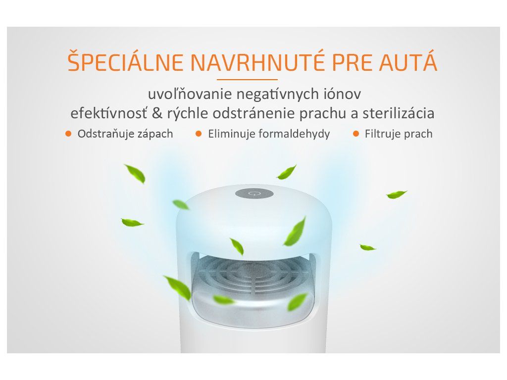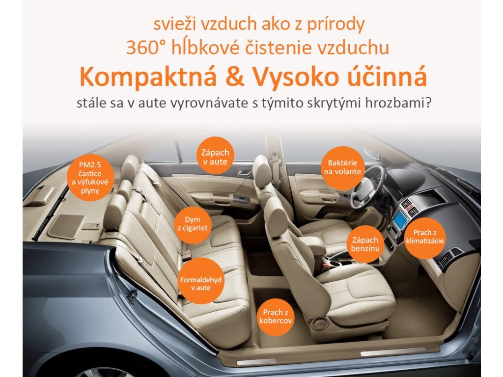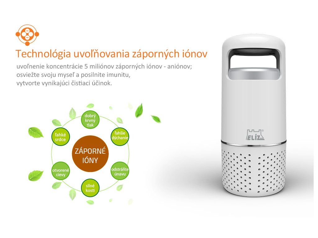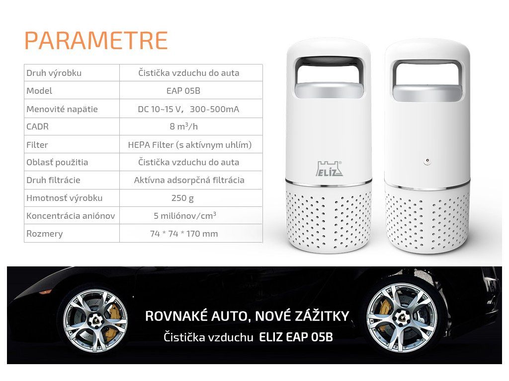 Veľa ľudí sa zaujíma o kvalitu vzduchu, ktorý dýchajú v domácnosti. Avšak menej ľudí rieši kvalitu vzduchu v ich aute. Stále sa v aute vyrovnávate s týmito skrytými hrozbami, ako sú nečistoty, prach, peľ, zápach z klimatizácie, zápach výfukových plynov a pod.? Dýchajte prirodzene aj vo vašom aute! Vďaka čističke vzduchu ELÍZ EAP 05B, špeciálne navrhnutej pre autá, si doprajete čistý a svieži vzduch aj v aute počas ciest. Kompaktná a vysoko účinná Tento malý zázrak filtruje prach a pevné nečistoty, peľ, baktérie, odstraňuje zápach, dym z cigariet a eliminuje formadelhydy. 360° cyklické hĺbkové čistenie vnútorného priestoru auta vám zabezpečí vysokú účinnosť čistenia a prinesie pohodu, ktorú určite ocení každý, najmä alergici. Čistička vzduchu do auta má zabudovaný účinný HEPA filter s aktívnym uhlím a pracuje na princípe adsorpčnej filtrácie vzduchu. HEPA filter vďaka svojej štruktúre z mikrovlákna s veľkosťou pórov 0,01 μm a s prímesou aktívneho uhlia dosahuje mieru filtrácie vzduchu viac ako 99,9%. Technológia uvoľnovania záporných iónov Čistička vzduchu do auta je vybavená tiež ionizátorom, ktorý do vzduchu uvoľnuje záporné ióny - anióny a vďaka tomu vytvorí vynikajúci čistiaci účinok, osvieži vašu myseľ a posilní imunitu. Prítomnosť záporných iónov vo vzduchu zvyšuje prívod kyslíka do mozgu, znižuje krvný tlak, podporuje krvný obeh a metabolizmus a posilňuje imunitu ľudí. Dotykové ovládanie a senzor kvality vzduchu Čistička sa pohodlne ovláda dotykovým vypínačom, ktorý zároveň slúži ako svetelný senzor kvality vzduchu. Farebne indikuje mieru znečistenia vzduchu v aute. Hlavné výhody čističky vzduchu do auta: Kompaktná a vysoko účinná HEPA filter s aktívnym uhlím Adsorpčná filtácia 360° nasávanie vzduchu CADR 8 m3/hod Ionizátor, 5 miliónov záporných iónov na cm3 Farebná indikácia znečistenia vzduchu Napájanie cez 12 V autozapaľovač Tichá prevádzka, hlučnosť < 40 dB Hmotnosť len 250 g Rozmery 74 x 74 x 170 mm Návod - EAP 05B (SK/CZ/EN)%Dodatočné parametre