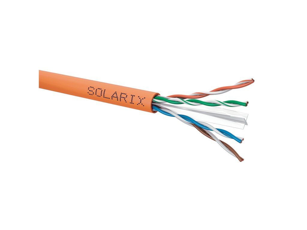 The Solarix installation cable with the designation SXKD-6-UTP-LSOHFR-B2ca is a high quality unshielded four-pair cable of category 6 with LSOHFR sheath and reaction to fire class B2ca s1 d1 a1. This cable complies with the Decree of the Ministry of Interior of the Czech Republic No. 23/2008 and Decree No. 268/2011 on technical conditions of fire protection of buildings and is suitable for the uses corresponding to the cable with this reaction to fire class, which are defined in Annex No. 2 of the above mentioned Decrees. This Solarix cable has been tested by a notified body in accordance with EU Regulation 305/2011 (CPR) under the Assessment and Verification of Stability of Performance System 1+ (AVCP 1+). The cable conductors are made of high quality copper wire with AWG 23. The individual pairs of category 6 cables are separated by a plastic cross. The SXKD-6-UTP-LSOHFR-B2ca cable is marked with a continuous meter gauge of 1 m and is supplied on a high strength wooden reel on which all necessary product information is provided, including bar codes, production lot, description and the most important technical parameters. The sheath colour of this category 6 cable is RAL 2003 orange. Solarix installation cables with reaction to fire class B2ca s1 d1 a1 and LSOHFR sheaths meet the standards: A) Acidity of gases produced during combustion IEC 60754-2: Test on gases evolved during combustion of electric cables - Part 2: Determination of degree of acidity of gases evolved during the combustion of materials taken from electric cables by measuring pH and conductivity EN 60754-2: Test for gases evolved during combustion of materials taken from cables - Part 2: Determination of acidity (by measuring pH) and conductivity B) Smoke density IEC 61034-2: Measurement of smoke density of cables burning under defined conditions - Part 2: Test procedure and requirements EN 61034-2: Measurement of smoke density of cables burning under defined conditions - Part 2: Test procedure and requirements C) Flame retardancy/flame spread of single insulated cables IEC 60332-1-2: Tests on electric and optical fibre cables under fire conditions - Part 1-2: Test for vertical flame propagation for a single insulated wire or cable - Procedure for 1 kW pre-mixed flame EN 60332-1-2: Tests on electric and optical fibre cables under fire conditions - Part 1-2: Test for vertical flame propagation for a single insulated wire or cable - Procedure for 1 kW mixed flame (D) Regulation 305/2011 (CPR) EN 50575:2014 including Supplement A1:2016: Power, control and communication cables - Cables for general use in buildings in relation to reaction to fire requirements. Parameters and specifications: Category: CAT6 Supported protocols: 2.5/5GBASE-T and below Shielding: no Bandwidth: 250 MHz Conductor type and size: copper wire 0.55 mm ± 0.005 mm Insulation and wire diameter with insulation: HDPE 0, 98 mm Class of reaction to fire, sheath type: B2ca s1 d1 a1, LSOHFR Sheath colour: orange RAL 2003 Cable diameter: 6, 6 mm Weight: 53, 9 kg/km NVP: 69 % Propagation delay: 535 ns/100 m Delay skew: ?45 ns/100 m Storage temperature: -20 °C to 60 °C Operating temperature: -20 °C to 60 °C Installation temperature: 0 °C to 50 °C Packaging: 500 m, wooden coil Package dimensions (diameter x height): 370 mm x 320 mmAdditional parameters