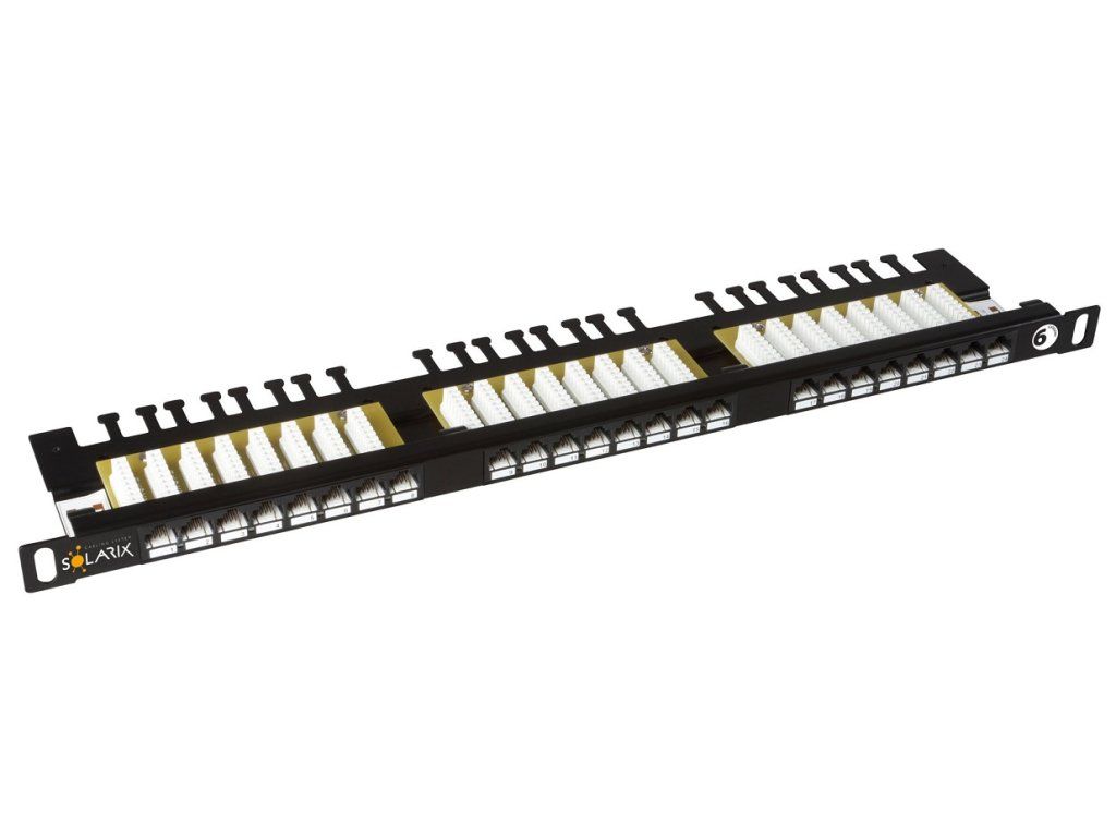 The Solarix patch panels, labeled SX24HD-6-UTP-BK, are high-density 19" patch panels with a height of 0.5U that are equipped with 24 RJ45 ports and dual 110/Krone IDC terminals. The emphasis with these panels is on maximum space saving in the rack, where up to 48 ports can be easily installed in a 1U height. These high-density Solarix panels are available in both shielded and unshielded versions and seamlessly meet the requirements defined in the international standards ANSI/TIA 568, ISO/IEC 11801 and EN 50173 including all the latest additions for Category 6 and Class E wiring. The panels are designed to be robust, reliable, provide maximum performance and allow for easy installation. The body of these panels includes a tie bar that allows for a tight fit and a clear arrangement of the data cable. The color of the Solarix unshielded high-density patch panel is black. Technical parameters: CAT6 Supported protocols : 2.5/5GBASE-T and below Number of ports : 24 Shielding : No Tie bar : yes Min. port life : 1000 connections/disconnections Contact Coverage : 50 µ gold and 100 µ nickel Terminal block : dual 110/Krone 8p8c Min. terminal life : 200 notches Wire size and type : AWG 26 - 22, wire Material of non-metallic parts : FR plastic according to UL94-0 Color: Black Size : 0.5U Height: 22 mm Width: 484 mm Depth: 100 mm Storage temperature: -40 to 70°C Operating temperature: -10 to 60°C Max. operating humidity: 93%Additional parameters