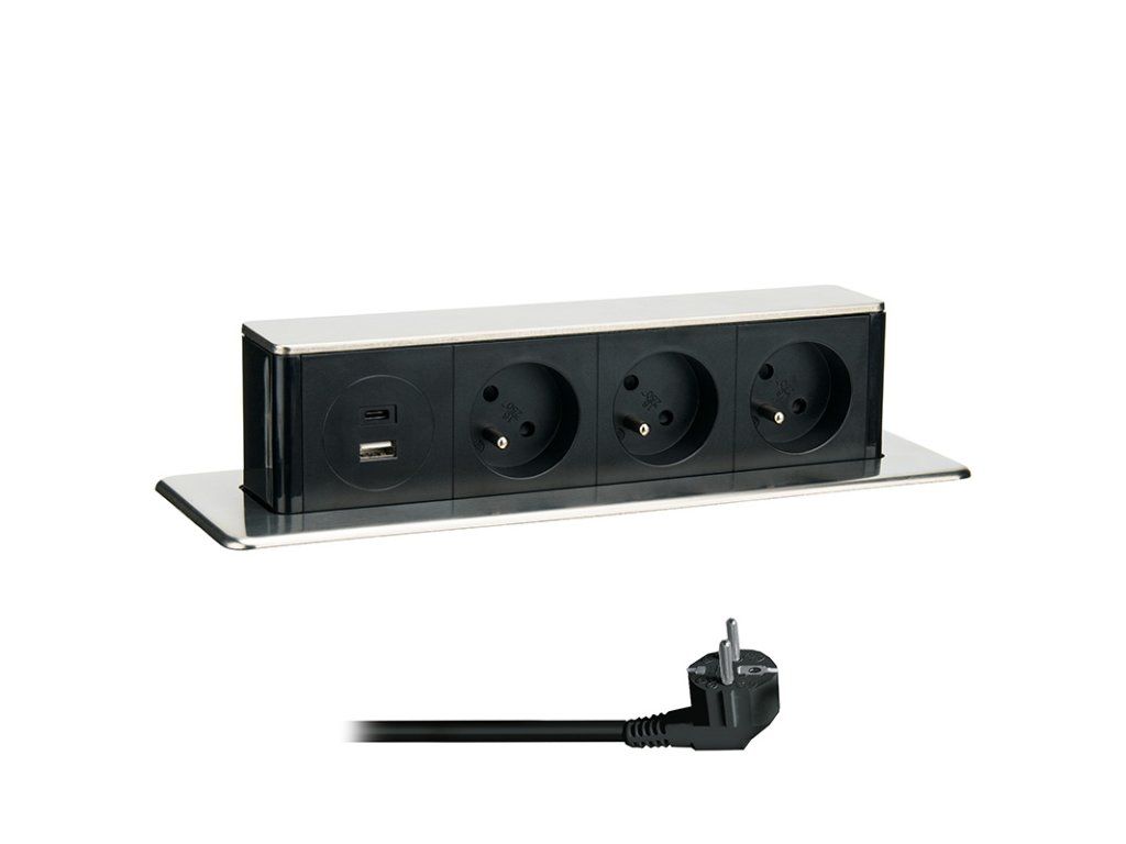 Elegant countertop solutions The pull-out block with drawers is a practical accessory for worktops and tables, allowing easy access to electrical connections only when needed. This saves space and keeps the work area clear. The stainless steel top cover in silver adds a modern look and ensures resistance to everyday use. Three drawers with child safety lock The block contains three sockets with a voltage of 230 VAC and a maximum current of 16 A, allowing a total power output of up to 3680 W. The sockets are equipped with child-proof fuses for added safety and are suitable for connecting various electrical devices. Modern USB fast charging The device features a USB-A port with Quick Charge 3.0 technology (up to 18 W) and a USB-C port with Power Delivery support (up to 20 W). When using both ports simultaneously, the maximum charging power reaches 17 W, enabling efficient charging of modern devices. High-quality cabling and easy installation The block includes a 2 meter long PVC cable with a low profile angled fork. A 246 × 58 mm hole is required for installation. The pull-out mechanism blocks 60 mm above the plate in the extended position and occupies 94 mm below the plate. - pull-out block with drawers for worktops and tables - elegantly concealed, only slides out when needed and does not take up unnecessary space - stainless steel top cover - 3 sockets 230VAC / 16A, max. 3680W, child safety fuses - USB fast charger: - USB-A QC 3.0: 5.0V/3.0A, 9.0V/2.0A, 12.0V/1.5A,18W - USB-C PD: 5.0V/3.0A, 9.0V/2.22A, 12.0V/1.67A, 20W Power Delivery - with simultaneous USB A+C charging: max. 5.0V/3.4A, max. 17W - cable: PVC, 3 x 1.5mm2, type H05VV-F 3G, angled fork with low profile from the wall - length: 2m (1.9m visible) - top cover colour: silver - table top hole size: 246 x 58mm - height of the extension block above the top edge of the table top: 60mm - height of the block below the top edge of the board: 94mm Product parameters: USB USB A+C version Length (m) 2 Degree of protection (IP) IP20 Color Silver Number of USB ports 2 Number of sockets 3 Cross section (mm2) 1.5 Voltage (V) 230 V Switch No Type of extension lead Built-in socket Maximum load (W) 3680 Wireless charging No Grounded Yes USB charging YesAdditional parameters