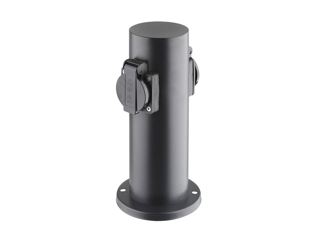 Solight garden light IP44, stainless steel, 2 sockets, cylinder, black product features: stainless steel electric bollard power supply for outdoor areas, gardens and orchards 2 sockets max. 16A, 3680W, child safety and self-closing caps against moisture and dust terminal block with earthing for connecting the supply cable inside the post base with mounting holes for fixed surfaces colour: matt black, black socket covers protection class: IP44 dimensions: post - 7.5 x 7.5 x 23cm base - 11 x 11cmAdditional parameters