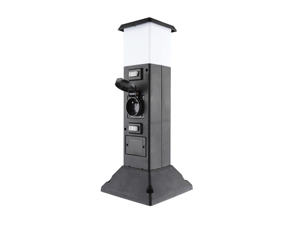 Solight garden post IP44 with LED lighting, plastic, 2 sockets, prism, black Product parameters: - electric distribution post with LED light - stable or portable power and lighting supply for outdoor areas - base with mounting holes for hard surfaces, screw-in tip for insertion into soft surfaces - 2 sockets max. 16A, 3680W, child-proof fuses and self-closing caps against moisture and dust - E14 socket for LED bulb, max. 15W - separate switches for each electrical socket and light - terminal block with earthing for connecting the supply cable - colour: matt black, black socket covers - material: plastic - protection class: IP44 - dimensions: - post - 8,5 x 8,5 x 40cm - base - 16 x 16cmAdditional parameters
