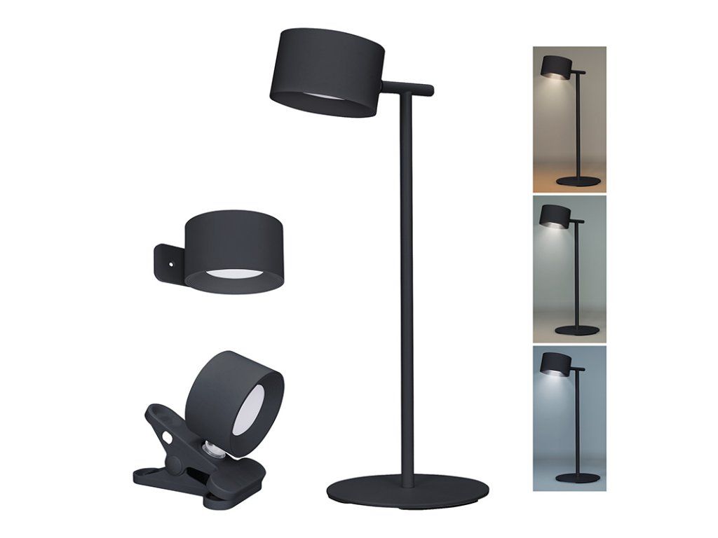 Solight LED Rechargeable Lamp 3in1, 280lm, CCT change, dimming, black LED rechargeable dimmable lamp with changeable light temperature 3in1 - lamp can be placed on a table stand, clip or wall bracket (all included) the lamp can be carried and powered from the built-in battery or used plugged in with a USB cable power consumption: max. 4W luminous flux: max. 280lm selectable light temperature (chromaticity): 3000K, 4000K, 6500K (warm, neutral and cool white) dimmable: 3 brightness levels switching, changing brightness and chromaticity with the touch of a finger illumination angle: 120° colour rendering index: CRi>80 li-Ion 18650, 3.7V 2000mAh battery battery life: approx. 3.5hrs at 100% power battery power time: approx. 3h power supply: DC 5V; 1A (cable included, adapter not included) LED power supply cannot be changed max. size: approx. 320 x 120 x 140mm uSB power cable length: 150cm colour: black material: ABSAdditional parameters