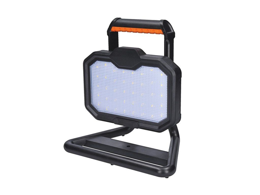 Solight LED spotlight 20W, portable, rechargeable, 2000lm, orange-black Specifications: - portable, rechargeable and positionable LED spotlight - luminous flux: max. 2000lm* - power: max. 20W - chromaticity temperature: 4000K (neutral white) - light source: 40x SMD2835 LED - light modes: 100%, 50%, 20% - Li-Ion battery (4400mAh, 3.7V) - battery life: min. 2h/max. 10h - charging time: battery approx. 4h - overcharge protection - lED lifetime: 20,000 hours - protection: IP54 (splash water protection, suitable for outdoor use) - light cone: 120° - power supply: USB-C 5V connector (power cable included) - dimensions: 20 x24 x 6.5 cm - operating temperature: -10°C to +50°C - material: ABS, PC - color: orange-black - maximum luminous flux is reached when fully chargedAdditional parameters