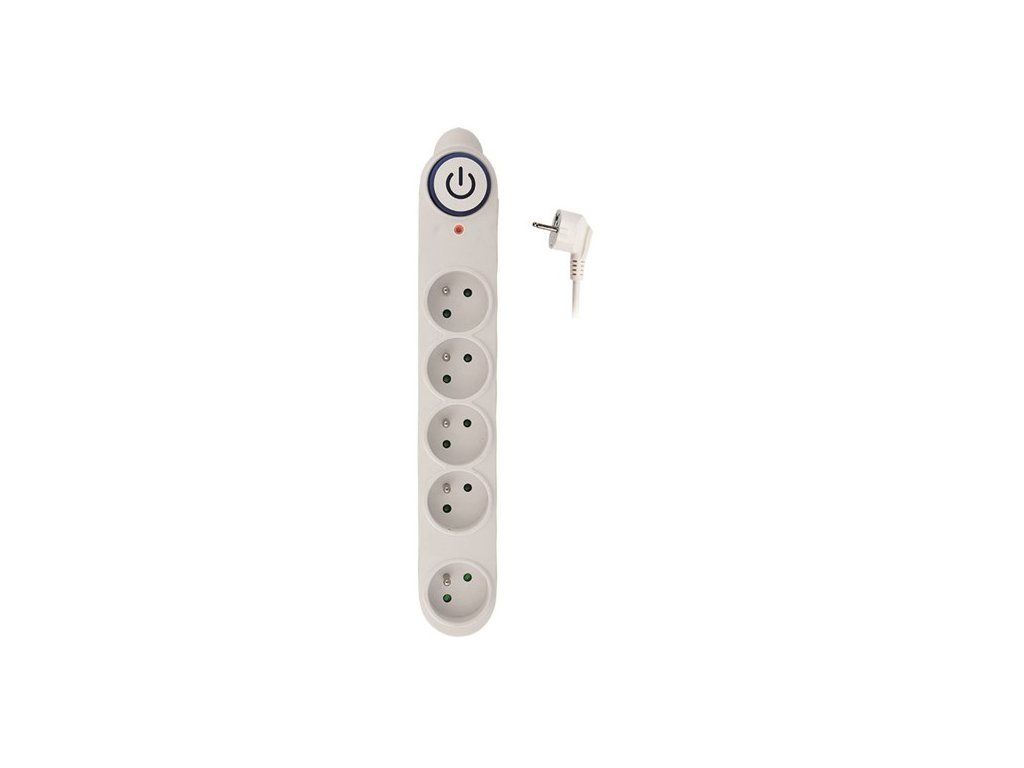 Surge protector suitable for protecting your appliances from overvoltage. Features: - 5 sockets with childproof fuses - large illuminated switch - separate socket for large power adapters - full 3-pole surge protection on all wires (L-N, L-PE, N-PE) - maximum voltage: nominal - 250V, limiting - 775V, peak - 3000V - maximum current load: nominal - 10A, peak - 4500A - leakage current: <1mA - protection level Up: <= 2kV (L/N, L-PE, N-PE) - rated discharge current: 100A - 8/20µs - max. discharge current: 9kA - 8/20µs - response time: <100ns - thermal shock absorption 150J - surge protection active "Protected" indicator - power cable: length: 5m, conductors: 3 x 1.0mm2 - color: whiteAdditional parameters
