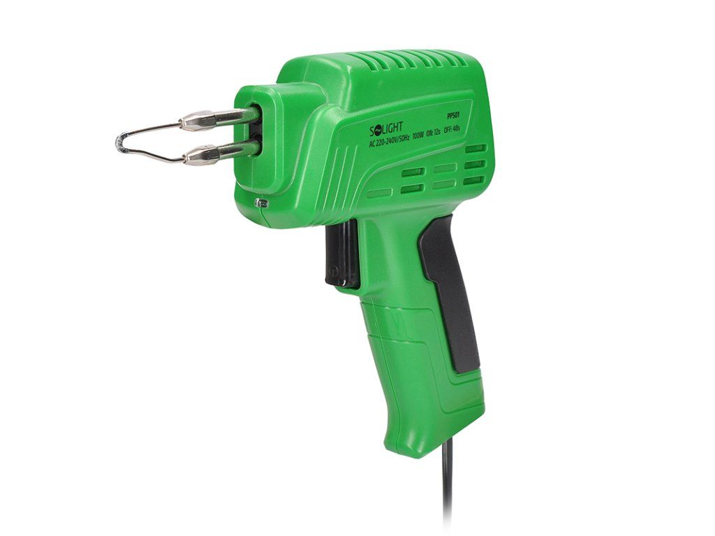 Soldering gun 100W set Soldering set 100W in a handy carrying case, ideal for home and professional use. Includes soldering iron with soldering eyelet 1,8 mm, spare loops, rosin and tin (Sn 99,3%, Cu 0,7%). Power supply 230V / 50Hz, length of supply cable 120 cm. Perfect set for precise and reliable soldering. Product parameters: - Power consumption 100 W - Supply voltage 230 V / 50 Hz - Soldering eyelet: 1.8 mm - Length of power cord: 120 cm - Power: 100 W - Type Package contents: case soldering iron spare loops rosin tin (Sn 99,3%, Cu 0,7%)Additional parameters