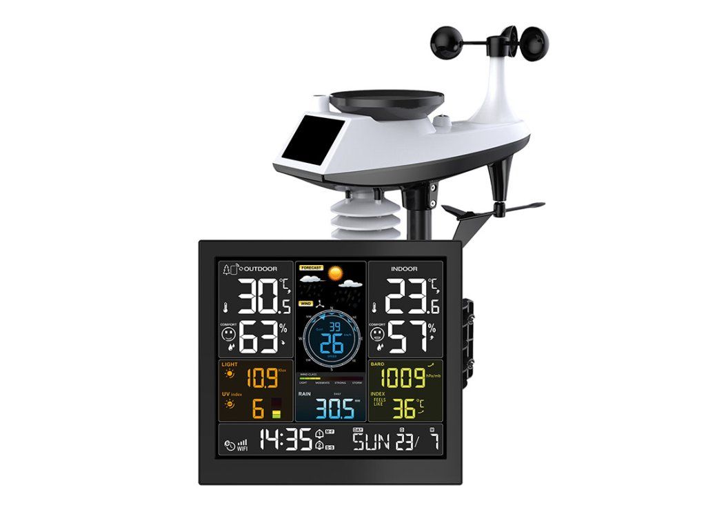 Professional smart WIFI weather station This professional weather station with a large 24.4cm display offers WiFi connectivity and connects to the Tuya/Smart Life app to display current readings and statistics. It measures indoor (-20°C to 50°C) and outdoor temperature (-40°C to 70°C), humidity (20% to 95%), wind speed (0 to 180 km/h), wind direction (0-359°), precipitation (0 to 9999 mm), atmospheric pressure (600-1100 hPa), light intensity (0-128 klux) and UV index (0-15). It offers automatic time synchronisation, day of the week display in 15 languages, two daily alarms with snooze function (5-60 min or off) and a calendar up to 2099. The 12-hour weather forecast uses air pressure and displays icons such as sunny, cloudy, rain or snow. Wireless sensors with a range of up to 100 m allow for connection of 1× multi-combination sensor and up to 3 temperature/humidity sensors. Power supply DC 5V / 1A adapter + 2× AA battery backup, sensors on AAA batteries. App connectivity, a wide range of measurements and precise processing make it the ideal choice for those who want to have weather data always at hand. Product parameters: - large and clear display with a size of 24.4 cm - wiFi connectivity and Tuya/Smart Life connection supported - records temperature, humidity, wind speed, precipitation, light intensity - automatic time synchronisation via network service - day of the week display in 15 languages including English - two daily alarms with snooze function (5-60 minutes or off) - temperature measurement: - indoor: -20°C to 50°C - outdoor: -40°C to 70°C - humidity measurement: - 20% to 95% range - wind measurement: - 0 to 180 km/h (0-111 mph) - direction: 0-359° (12 Beaufort scale levels) - precipitation: - measurement range: 0 to 9999 mm (0-393.6 inches) - air pressure: - 600 to 1100 hPa (450-825.1 mmHg) - light and UV index: - light intensity: 0-128 klux (0-1378 kfc) - UV index: 0 to 15 - calendar up to 2099 - wireless sensors: - frequency: 433.92 MHz RF - range: 100 meters (in open area) - maximum number of connected sensors: - 1× multi-combination sensor - 3× temperature/humidity sensor (optional, not included) - connection with Tuya Smart app: - automatic time update via WiFi - display and statistics of measured values - unit settings (°C/°F, mmHg, km/h, etc.) - alarm and backlight settings - weather forecast: - approximate 12-hour forecast based on air pressure - icons: sunny, cloudy, cloudy, rain, storm, snow - calibration takes 7-10 days, 70-75% accuracy - low battery indication: - low battery warning for main unit and sensors - power supply: - main unit: - adapter: DC 5V / 1A - battery: 2× AA (for backup) - sensors: - multi-combination sensor: 3× AAA - temperature/humidity sensor (optional): 2× AAA - color blackAdditional parameters