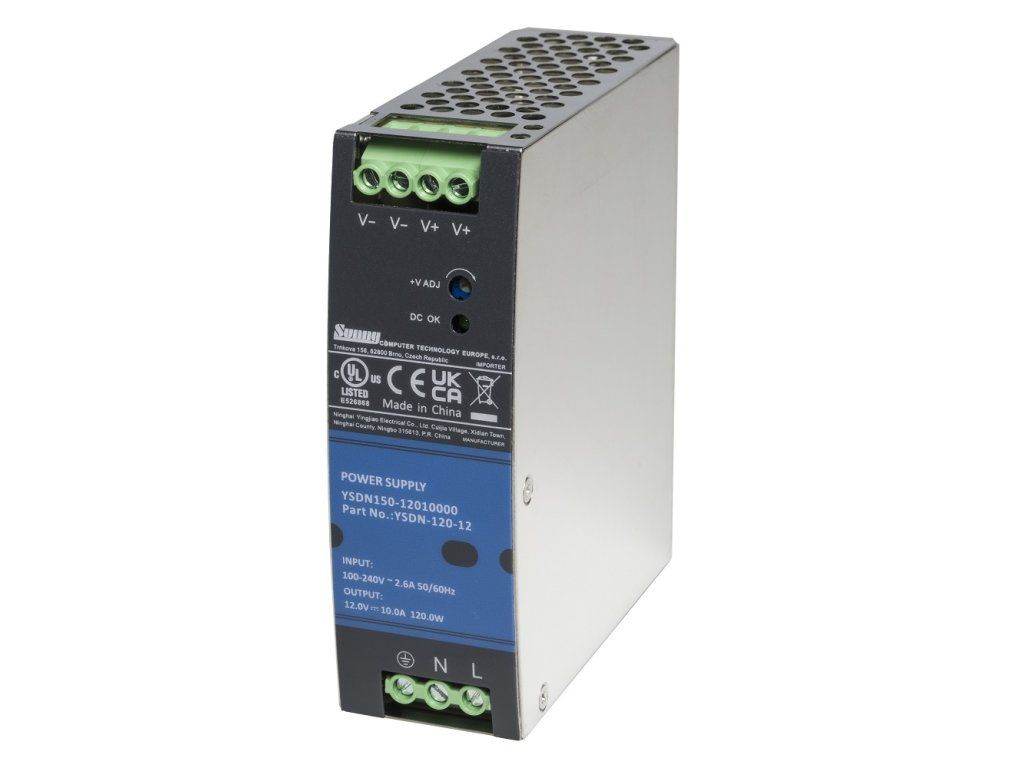 Sunny YSDN is a series of slim DIN rail power supplies (TS-35/7.5 or 15) in metal housing with power output of 75-480W, suitable for use in industrial automation, control and monitoring systems, etc. The input voltage is in the full range of 90 - 264V AC. The power supplies feature adjustable output voltage, active PFC, high efficiency and operate over a wide temperature range. Product information: Product code YSDN12012 YSDN150 series 12V output voltage Power 120W Output current 10A Net weight 0.517 kgAdditional parameters