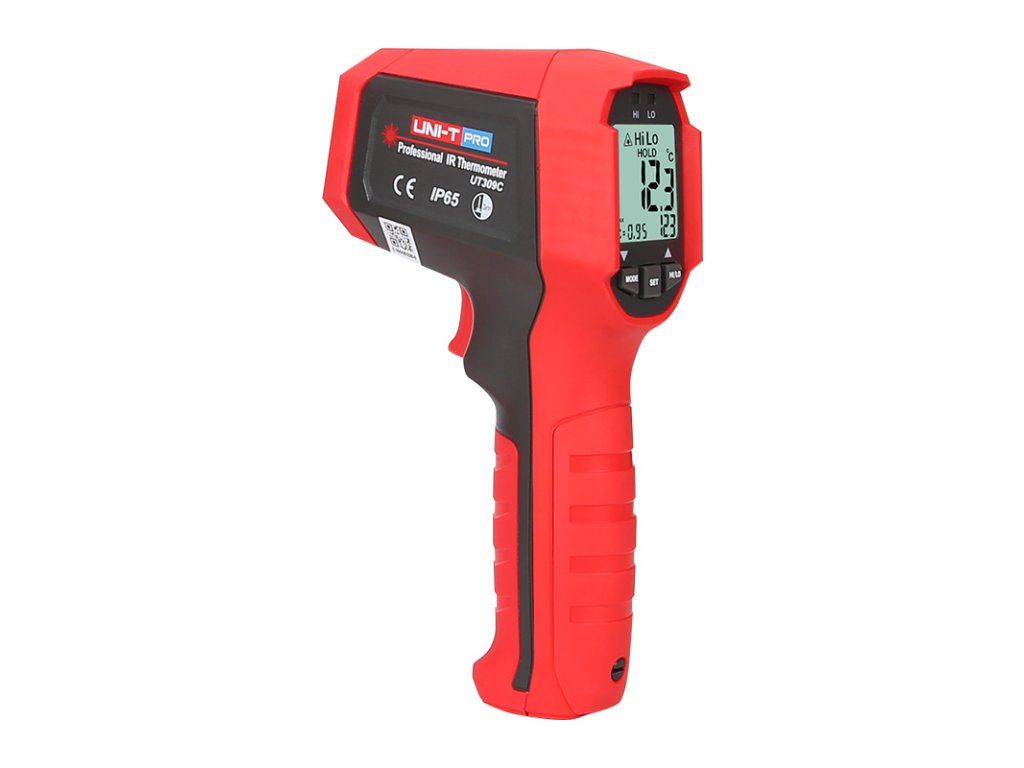 This product comes with a 3-year warranty. The UT309C professional non-contact infrared thermometer can quickly and accurately determine surface temperature between -35°C and +650°C by measuring the infrared energy emitted from the target surface. The UT309C is a very durable instrument suitable for everyday use. It is drop resistant from 3m and the excellent IP65 rating ensures good water and dust resistance. To make it easier and more intuitive to aim the instrument at the target surface, a dual wavelength rotating laser is incorporated to indicate the correct aim of the thermometer. The ratio of distance to diameter of the surface to be measured is 12 :1. It is possible to preset the emissivity of the measured surface in the range of 0.1 to 1.0. The indication of preset functions and measured values is provided by a high-contrast LCD black and white display, and the exceeding of temperature limits is indicated by LEDs ( exceeding the upper limit red and lower limit blue ). It is possible to set continuous measurement, where after 2 minutes the display backlight is switched off, after the measurement is finished by pressing the trigger again the temperature value remains on the display. The temperature measurement time is in 95% of cases within 250msec. It is possible to display the minimum, maximum and average temperatures and the difference between the highest and lowest measured temperature ( MIN, MAX, AVG, DIF ). The thermometer automatically switches off, to reduce power consumption, if it is unused for 8 s. This switching off can be switched off. Product parameters : - infrared thermometer for non-contact surface temperature measurement - temperature range - 35°C to +650°C, can be switched to °Fahrenheit - delineation of the surface to be measured by dual laser - the ratio of the distance to the diameter of the surface to be measured is 12 :1 - contrasting backlit black and white LCD display measuring 32 x 29 mm - indication of exceeding limit values by LED (red, blue) - tripod mounting hole Specifications : - temperature range: -35°C to +650°C (-31°F to 1202°F) - temperature measurement accuracy greater than or equal to 0°C: ±1.8°C or ±1.8% of measurement, whichever is greater - temperature measurement accuracy <0°C: ± (1.8°C + 0.1°C /°C measurement, whichever is greater) - temperature measurement accuracy greater than or equal to 32°F: ± 3.6°F or ± 1.8% of measurement, whichever is greater - temperature measurement accuracy <32°F ± (3.6°F + 0.1°F /°F measurement, whichever is greater) - measurement resolution: 0.1°C - measurement repeatability: ±1.0°C (1.8°F) or 0.8% reading, whichever is greater - spectral response: 8µm to 14µm - response time 95% of the time: 250 ms - the distance to diameter ratio of the surface to be measured for this instrument is 12 :1 - laser delineation of the measurement area: yes - class 2 dual laser: wavelength 630nm to 670nm, output power less than or equal to 1mW - display: 32 x 29 mm contrast black and white LCD display - lED indication of temperature limits (red, blue) - emissivity of the measured surface can be adjusted from 0.1 to 1.0 in steps of 0.01 - automatic switch-off when idle - power supply: 9V battery (1604A) - battery life : continuous temperature measurement greater than or equal to 10 hours with backlight on - low battery indication: yes - drop test from height: 3 m - hI/LO temperature alarm mode (High/Low alarm with LED indication) - mAX / MIN / AVG / DIF value suspension - operating temperature: 0°C to 50°C (32°F to 122°F) - operating humidity: <90% RH (non-condensing) - operating altitude: max.12000m - storage temperature: -20°C to 60°C (-4°F to 140°F) - product colour: red and grey - net product weight: 292 g - product size (l x w x h): 189 x 118 x 55 mm Package Contents : - uT309C PRO thermometer: 1pc - 9V battery: 1pc - packaging: 1pc blister - manual: 1pcAdditional parameters