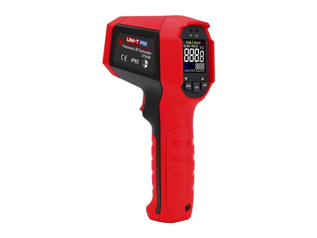 The UT309E professional non-contact infrared thermometer can quickly and accurately determine surface temperatures between -35°C and +850°C by measuring the infrared energy emitted from the target surface. To make it easier and more intuitive to aim the instrument at the target surface, a dual-wavelength rotating laser is incorporated to indicate the correct aim of the thermometer. The ratio of distance to diameter of the surface to be measured is 20 :1 for this instrument. This thermometer is also IP65 rated against water and dust and can withstand a drop from up to 3 meters. It is possible to preset the emissivity of the surface to be measured between 0.1 and 1.0. The indication of the preset functions and measured values is provided by a bright and high contrast EBTN colour display and the limit values are indicated by LEDs. It is possible to set the system time and schedule repeat measurements in the future with a set maximum interval of up to 96 hours between two measurements up to 99 measured values stored in memory. For each stored value, the measurement time is also stored. These measurements make use of the built-in standard hole for attaching to a tripod. Temperature measurement time is within 250msec 95% of the time. It is possible to set a minimum and maximum limit of values, and when values are measured outside this interval, this is indicated acoustically and visually. Indication of minimum, maximum and average temperatures and deviations from the average ( MIN, MAX, AVG, DIF ) is possible. The thermometer switches off automatically, to reduce power consumption, if it is without use for 8 s. This switching off can be switched off. Product parameters : - infrared thermometer for non-contact measurement of surface temperatures - temperature range - 35°C to + 850°C, can be switched to °Fahrenheit - delineation of the surface to be measured by circular laser indication - the ratio of the distance to the diameter of the surface to be measured is 20 :1 - 32 x 32 mm EBTN contrast colour display - lED indication of limit values - precise system time, programming of interval temperature measurement - memory for 99 sets of measurements - tripod mounting hole Technical parameters : - temperature range: -35°C to +850°C (-31°F to 1562°F) - temperature measurement accuracy less than or equal to 0°C: ±1.8°C or ±1.8% of measurement, whichever is greater - temperature measurement accuracy <0°C: ± (1.8°C + 0.1°C /°C measurement, whichever is greater) - temperature measurement accuracy greater than or equal to 32°F: ± 3.6°F or ± 1.8% of measurement, whichever is greater - temperature measurement accuracy <32°F: ± (3.6°F + 0.1°F /°F measurement, whichever is greater) - spectral response: 8µm to 14µm - response time 95% of the time: 250 ms - the ratio of distance to diameter of the surface to be measured is 20 :1 for this instrument - delineation of the circular measurement area by the laser: yes - class 2 rotating dual laser: wavelength 630nm to 670nm, output power less than or equal to 1mW - display: 32 x 32 mm contrast colour EBTN back-illuminated display - lED indication of temperature limits - emissivity adjustment of the measured surface between 0.1 and 1.0 - measurement lockout for processes that require long-term temperature monitoring - system time, programming of interval temperature measurement - memory for 99 sets of measurements - automatic shutdown during inactivity - power supply: 9V battery (1604A) - battery life: continuous temperature measurement greater than or equal to 16 hours - low battery indication: yes - drop test from height: 3 m - tripod mounting hole: yes - hI/LO temperature alarm mode (High/Low alarm with LED indication) - mAX / MIN / AVG / DIF value suspension - operating temperature: 0°C to 50°C (32°F to 122°F) - operating humidity: <90% RH (non-condensing) - storage temperature: -20°C to 60°C (-4°F to 140°F) - product color: red and gray - net product weight: 292 g - product size (L x W x H): 189 x 118 x 55 mm Package Contents : - uT309E PRO thermometer: 1pc - 9V battery: 1pc - packaging: 1pc blister - manual: 1pcAdditional parameters
