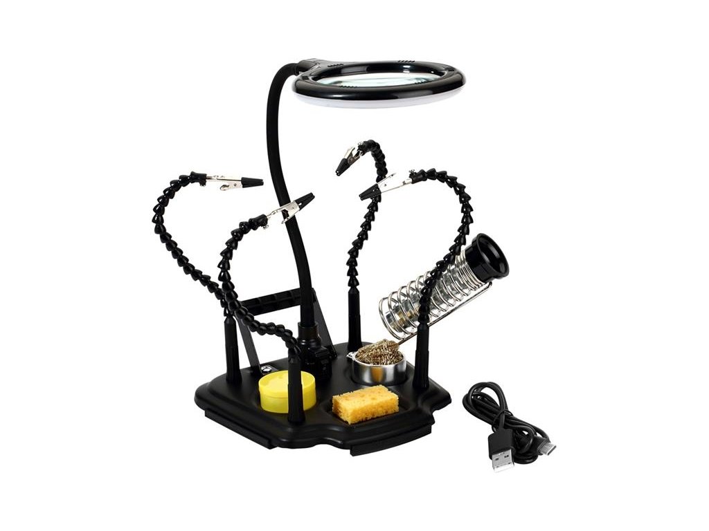 Tretia ruka ZD-11M-4 s LED. Montážny držiak so štvorramennou lupou. Na toto tretie rameno môžete pripevniť dosku plošných spojov, šperky alebo jednoducho čokoľvek, čo potrebujete spájkovať, zvárať alebo modelovať. Vďaka nemu máte obe ruky voľné. Ide o spoľahlivý nástroj, s ktorým sú aj tie najzložitejšie úlohy jednoduché a prínosné. Vďaka robustnej konštrukcii a svorkám upevníte materiál pevne na pracovnú plochu bez toho, aby ste ho museli držať rukou, čím si uľahčíte a spresníte prácu.