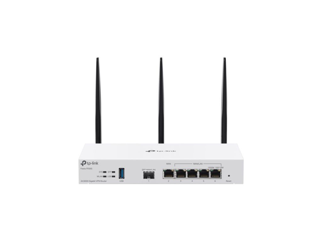 TP-Link Festa FR365 gigabit Multi-WAN VPN WiFi6 router with support for central management via Festa cloud or Festa app. The router has 5x gigabit ETH ports in a layout of 1× WAN, 4× WAN/LAN and for optical connectivity 1x SFP WAN/LAN port. Multiple WAN ports allow you to set up Load Balancing or Failover connection backup. A USB WAN port can be used for mobile network backup, which allows the use of a 4G/3G modem. The router features dual-band WiFi 6 with speeds up to 2402 Mbps in 5 GHz and 574 Mbps in 2.4 GHz. The router offers a wide range of VPN connectivity options with support for IPSec, PPTP, L2TP and OpenVPN, and the fanless design ensures quiet operation. Key Features - Dual-band WiFi 6 with speeds up to 2402 Mbps in 5 GHz and 574 Mbps in 2.4 GHz - Centralized management via Festa cloud or app - Multi-WAN with Load Balancing and Failover support - USB WAN port enabling 3G/4G modem use - VPN - IPSec, PPTP, L2TP and OpenVPN - Silent operation Package contents - Device - 12V/2A power adapter - Quick installation guideAdditional parameters