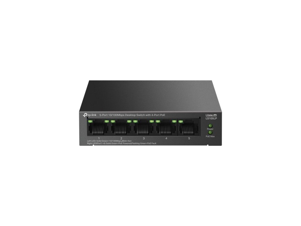 TP-Link PoE Switch LS105LP is a non-manageable PoE Switch with 5x 10/100Mbps LAN ports, of which 4 ports support PoE 802.3af up to 15.4W/port. The total PoE budget of the switch is 41W. The switch also allows PoE over a distance of 250m by switching a special switch, which causes the line rate on the PoE ports to drop to 10Mbps, which is sufficient for camera video transmission. Another feature is PoE auto recovery, which automatically restarts unresponsive PoE powered devices. Key Features - 4x 802.3af PoE-out - Total PoE budget 41W - Extended mode for distances up to 250m - PoE auto recovery automatically restarts unresponsive devices Package Contents - Switch - Power Adapter 53.5V/0.81A - Installation manualAdditional parameters