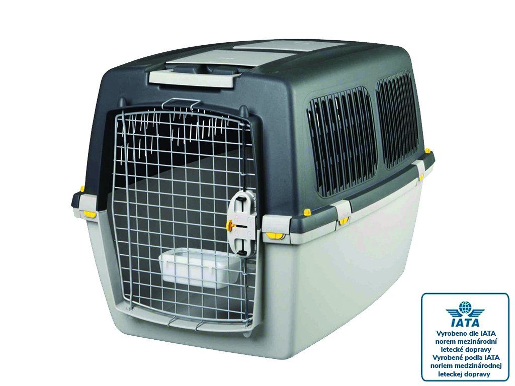 Forfor dogs up to 25 to 30kg, designed according to the International Air Transport Association IATA for transport on board the aircraft, lid and bathtub are connectedwith clips,4 screws in every corner asfuse, metal front door with paint and lock, can be setright or left opening door, extendable handle for pulling crates, two storage boxes on the roof, 500 ml bowl with anti-spill rims, internal dimensions 72,5x53x50,5cm, external dimensions81x61x60cm.
