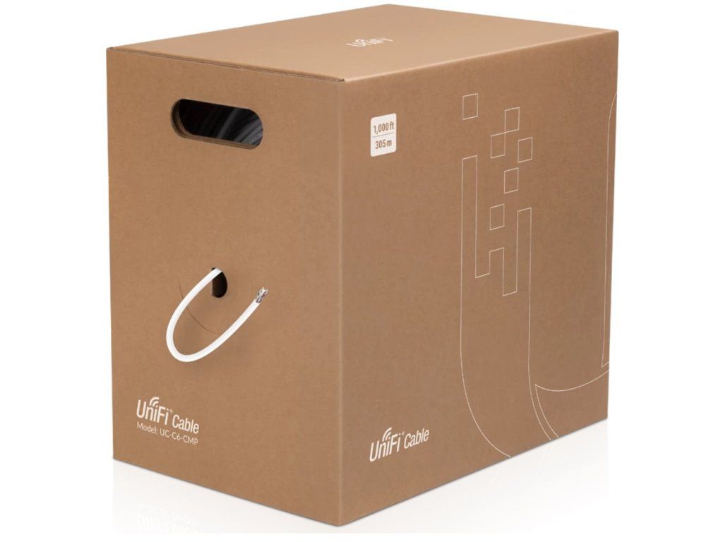 UniFi Cat6 UTP Ethernet cable with AWG23 wire gauge and anti-crosstalk separation supports speeds up to 1Gbps. The CMP (Communications Multipurpose cable, Plenum) cable is suitable for all horizontal installations in locations where high flame resistance and low smoke emissions are required. It is thus suitable for ceiling installations where air circulation for the building is located, etc. Technical parameters Physical characteristics Type of shielding: UTP (U/UTP) Cable cross-section: AWG23 Cable Type: Wire Use: Indoor Wire Material: Copper Length [m]: 305 Color: White General Category: CAT6 Bandwidth [MHz]: 600 Supported Protocols: 1000 Base-TAdditional parameters