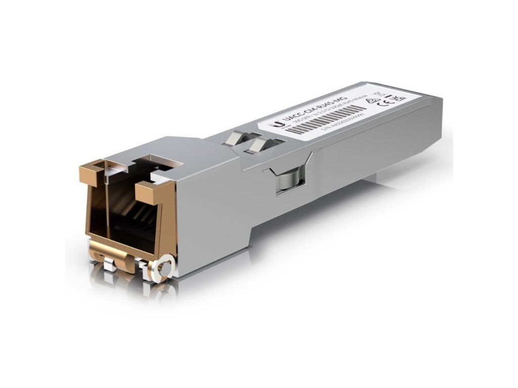 UACC-CM-RJ45-MG is a universal 10-Gigabit SFP+ metallic module from Ubiquiti Networks with RJ45 connector for metallic cable with 1G / 2.5G / 5G and 10 Gbps data rate. The range of the module is up to 100 meters when using Cat.6A cable, even at 10 Gbps. The maximum power consumption of the module is 1.9W and it is able to operate at temperatures from 0 to 70°C.Additional parameters