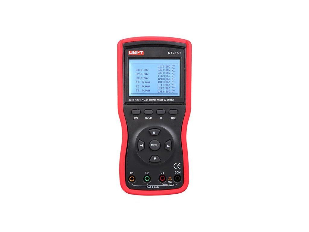UT267B is an intelligent three-phase high precision digital phase voltmeter specially designed for measurement in industrial working conditions. It is a fully automatic, multi-purpose instrument with low power consumption and simple operation. You can measure circuits without disturbing them, the instrument is capable of measuring three-phase voltage and current, phase angle between voltage and current or between three-phase voltages or currents, frequency, phase sequence, active, reactive and apparent power, power factor, sum of vectors, and is also capable of identifying transformer group wiring, inductive and capacitive circuits, secondary circuits, and differential bus protection system measurements. The instrument can also subtract the differential protection phase between CT units, check and ensure the correct wiring of electric meters. The dot-matrix LCD display is 240 dots × 160 dots and allows the display of voltage and current vectors. The instrument allows up to 99 sets of measured data to be stored in the internal memory, which can then be transferred to a PC via the RS232 interface. The supplied system software allows real-time online monitoring, history retrieval, dynamic display, data readout, storage, reporting, printing, etc. Together, these features represent a safe, accurate and convenient new tool offered to inspectors and electricians.