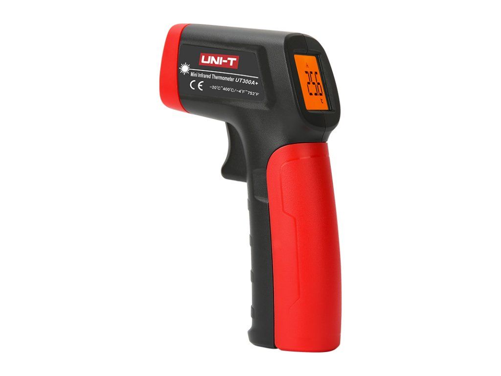 This product comes with a 3-year warranty. Not for medical purposes. The UNI-T UT300A+ non-contact thermometer is an economical infrared thermometer. Its compact and simple design makes it easy for users to carry and operate. The UT300A+ is designed for high accuracy, high measurement repeatability, fast response, long measuring distance and for other functions. It is suitable for surface temperature measurement of hard-to-reach or hazardous objects. Product Parameters : - simple one-button operation - measurement distance to measurement area diameter ratio 10 : 1 - data storage - display backlight - measured temperature range: -20 to 400 °C - units of measurement: °C / °F Technical parameters : - laser power: <1mW (class 2) - display size: 20 mm x 24 mm - temperature measurement range: -20 °C ~ 400 °C (-4 °F ~ 752 °F) - d : S ratio: 10 : 1 - emissivity: 0.95 - response time: greater than or equal to 500ms (95% of measurements) - spectral response: 5.5 to 14% - accuracy > 0 °C: ± 2.0 °C or ± 2 % - accuracy greater than or equal to 0 °C: ± (2,0 °C + 0,1 °C/°C) - accuracy >32 °F: ± 4,0 °F or ± 2 % - accuracy greater than or equal to 32 °F: ± (4.0 °F + 0.1 °F/°F) - repeatability: 1 °C or 1.0% (2 °F or 1.0%) - data Hold: yes - auto shut-off: 8s - low battery indication: yes - operating temperature: 0 °C ~ 50 °C (32 °F ~ 122 °F) - storage temperature: -20 °C ~ 60 °C (-4 °F ~ 140 °F) - operating humidity: <90% RH (non-condensing) - drop test: 1 m - power supply: 1.5 V batteries (LR03 AAA) x 2pcs - product color: red and grey - net product weight: 146 g - product dimensions: 135 mm x 94 mm x 36.5 mm Contents of individual packaging (blister) : - uNI-T UT300A+ thermometer - 1.5 V batteries (LR03 AAA) : 2pcs - operating instructionsAdditional parameters
