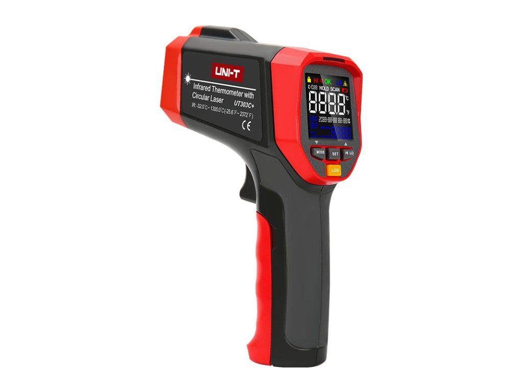 This product comes with a 3-year warranty. The UT303C+ infrared thermometer can quickly and accurately determine surface temperatures between -32°C and +1300°C by measuring the infrared energy emitted from the target surface. For easier and more intuitive aiming of the instrument at the target surface, a unique ring laser aiming indication is built in, which only Uni-Trend offers on its instruments. The ratio of distance to diameter of the surface to be measured is 30:1. It is possible to preset the emissivity of the surface to be measured from 0.1 to 1.0 and store the 5 most commonly used emissivities in memory. The indication of the preset functions and measured values is provided by a bright and contrasting EBTN colour display and the limit values are indicated by red, green and blue LEDs at the top edge of the instrument and a buzzer. It is possible to set the system time and schedule repeat measurements in the future with a set interval and store up to 99 measured values in memory. For each stored value, the measurement time is also stored. These measurements use the built-in standard hole for attachment to a tripod. The temperature measurement time is up to 250msec in 95% of cases. It is possible to set a minimum and maximum limit of values, and if values are measured outside this interval, this is indicated acoustically and visually. Indication of minimum, maximum and average temperatures and deviations from the average ( MIN, MAX, AVG, DIF ) is possible. Product parameters : - infrared thermometer for non-contact measurement of surface temperatures - temperature range - 32°C to + 1300°C, can be switched to °Fahrenheit - delineation of the surface to be measured by circular laser indication - setting and storage of 5 emissivity values in memory - the ratio of the distance to the diameter of the surface to be measured is 30:1 - 35 x 35 mm EBTN contrast colour display - indication of limit values by red, green, blue LEDs and buzzer - accurate system time, programming of interval temperature measurement - memory for 99 sets of measurements - tripod mounting hole Specifications : - temperature range: -32°C to 1300°C (-25.6? to 2372?) - temperature measurement accuracy less than or equal to 0°C: ±1.5°C or ±1.5% of measurement, whichever is greater - temperature measurement accuracy <0°C: ± (1.5°C + 0.1°C /°C measurement, whichever is greater) - temperature measurement accuracy less than or equal to 32°F: ± 3.0°F or ± 1.5% of the measurement, whichever is greater - temperature measurement accuracy <32°F: ± (3.0°F + 0.1°F /°F measurement, whichever is greater) - measurement repeatability: 0.7°C or 0.7% (1.5°F or 0.7% of measurement, whichever is greater) - spectral response: 8µm to 14µm - response time 95% of the time: 250 ms - the distance to diameter ratio of the surface to be measured for this instrument is 30:1 - delineation of the circular measurement area by the laser: yes - class 3R circular laser: wavelength 630nm to 670nm, output power ?3mW - display: 35 x 35 mm contrast colour EBTN back-illuminated display - limit indication by red, green, blue LEDs and buzzer - emissivity adjustment of the measured surface between 0.1 and 1.0 - 5 types of emissivity can be stored in memory - 5 sets of preset high/low temperature warning values can be stored in memory - measurement lockout for processes that require long-term temperature monitoring - system time, programming of interval temperature measurement - memory for 99 sets of measurements - automatic shutdown during inactivity - power supply: 9V battery (1604A) - battery life: continuous temperature measurement ?8 hours - low battery indication: yes - drop test from height: 1 m - tripod mounting hole: yes - mAX / MIN / AVG / DIF value suspension - operating temperature: 0°C to 50°C (32°F to 122°F) - operating humidity: <90% RH (non-condensing) - storage temperature: -20°C to 60°C (-4°F to 140°F) - product color: red and gray - net product weight: 310 g - product size (HxWxD): 172 x 113.5 x 53 mm Package contents : - uT303C+ thermometer: 1pc - 9V battery: 1pc - packaging: 1pc blister - manual: 1pc Packaging for wholesale customers : - standard carton quantity: 10pcs - standard carton dimensions (HxWxD): 425 x 335 x 365 mm - total carton weight: 6,65 kgAdditional parameters
