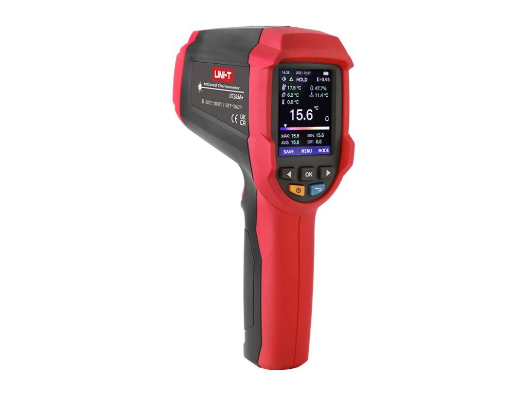 The UT305A+ professional non-contact infrared thermometer can quickly and accurately determine surface temperatures between -50°C and +1850°C by measuring the infrared energy emitted from the target surface. To make it easier and more intuitive to aim the instrument at the target surface, a laser is built in to indicate the correct aim of the thermometer. The ratio of distance to diameter of the surface to be measured is 55 :1 for this instrument. This thermometer has built-in additional functions, e.g. measuring the temperature of the thermometer surroundings, measuring the temperature with a K-type contact thermocouple, measuring the relative humidity of the thermometer surroundings. Based on these measured values, it calculates the dew point temperature or wet bulb temperature by itself. The system time and date can be entered into the thermometer. Measurement values can be scheduled at predetermined intervals and a total of 999 events (data groups) can be stored in the internal memory. The emissivity of the surface to be measured can be preset between 0.1 and 1.0. Indication of preset functions and measured values is provided by a bright and high-contrast TFT LCD color display, and limit values are indicated by a buzzer and on the display. Indication of minimum, maximum and average temperatures and deviations from the average (MIN, MAX, AVG, DIF) is possible. The instrument is drop-proof from a height of 1 meter. This non-contact infrared thermometer can be used in various fields such as food industry, machine maintenance, transportation equipment, metalworking, cold storage and other industries. - Infrared thermometer for non-contact surface temperature measurement - Temperature range -50°C to +1850°C, can be switched to °Fahrenheit - Delineation of the surface to be measured by laser indication - Mounting hole for tripod - The distance to diameter ratio of the surface to be measured is 55 :1 for this instrument - Contrasting 2.4" TFT LCD colour display - Indication of limit values by buzzer, on-screen display and LED tricolour function - Scheduled measurements set according to system time and 999 events stored in memory - Export data to computer in PDF or csv format - Power supply: lithium battery 3.7V/2600mAh, 18650 type TECHNICAL SPECIFICATIONS: - Infrared (IR) temperature range: -50°C to +1850°C (-58°F to 3362°F) - Ambient Temperature Range: -10°C to +50°C - K-type thermocouple temperature range: -50°C to 1370°C (-50°F to 1370°F) - Temperature range of the attached K-type contact bead thermocouple: -40°C to 260°C - Resolution: 0.1°C / 0.1°F - Relative humidity measurement range: 10 to 80% RH - Accuracy of IR measurement in the interval -50°C to 0°C: ±(1°C + 0.1°C/°C) - Accuracy of IR measurement in the interval 0°C to 1850°C: ±1°C or ±0.01 x t°C (whichever is greater) - Ambient temperature accuracy: -10°C to 0°C: ±1°C; 0°C to 40°C: ±0.5°C; 40°C to 50°C: ±1°C - Thermocouple temperature measurement accuracy: ±(0.005 x t + 1.5)°C - Relative humidity measurement accuracy: ±5% RH - Measured surface emissivity adjustment: yes; 0.1 to 1.0 in increments of 0.01, built-in emissivity table - Spectral response: 8µm to 14µm - Ratio of distance to diameter of the surface to be measured: 55 :1 - Class 2 laser: wavelength 630nm to 670nm, output power ?1mW, EN60825-1:2014 - Display: contrast colour TFT LCD with backlight, diagonal 2.4" - Display resolution: 320 x 240 pixels - Trigger lock (permanent measurement): yes - Power: 3.7V/2600mAh lithium battery, 18650 type - Battery charging time: ? 3 hours - Continuous operation time: ? 20 hours (if fully charged) - Automatic shutdown when idle: yes - Low battery indication: yes - Drop test from height: 1 m - Temperature alarm mode: HI/LO (High/Low alarm with audible indication) - MAX / MIN / AVG / DIF value suspension: yes - Operating temperature: -10°C to +50°C (14°F to 122°F) - Temperature coefficient : ±0.1°C/°C or ±0.1%/°C, whichever is greater - Operating Humidity : <90% RH (non-condensing) - Storage Temperature : -20°C to 60°C (-4°F to 140°F) - Product Color: Red and Gray - Product net weight: 375 g - Product size (l x w x h): 124 x 65 x 205 mm PACKAGE CONTENTS: - Thermometer UT305A, including battery: 1pc - USB-USB-C charging and data cable: 1pc - K-type contact bead thermocouple with 1m cable: 1pc - User manual: 1pcAdditional parameters