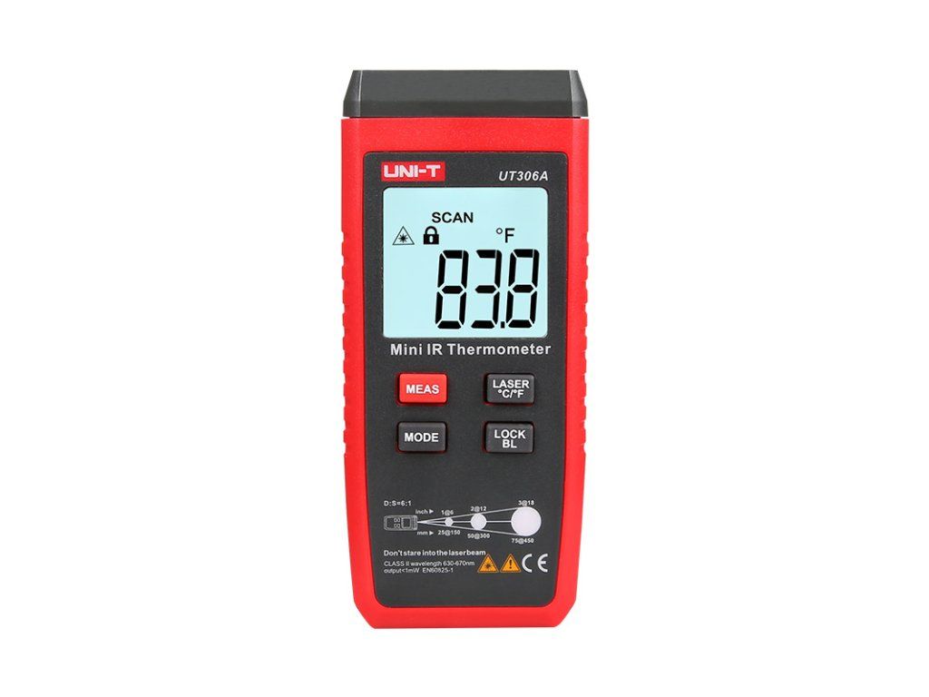 UT306A is a portable non-contact thermometer. Its miniature design makes it suitable for everyday carry and use. The device measures temperature based on the infrared radiation of objects, it is equipped with a laser pointer and therefore it is easy to measure the temperature of an object remotely without the need to attach a temperature probe. This method of measurement is particularly suitable for measuring objects that are difficult to access and to minimize the influence of the environment on the measurement result. Product parameters: - Precision digital non-contact thermometer with laser pointer - measurement in °C and °F, display of minimum, maximum and average temperature - 250 ms response time, wide application, compact size, continuous measurement capability Technical parameters: - Units of measurement: °C / °F - Measurement range °C: -35 to 300 - Measurement range °F: -31 to 572 - Resolution: 0.1°C / 0.2°F - Measurement deviation: ± 2.0°C / 4.0°F or ± 2% of measurement (higher value applies) - Response time: 250 ms - Length to width of field of view ratio: 6 : 1 - Emissivity: 0.95 - Measured wavelength: 8 µm - 14 µm Features: - Minimum, maximum and average temperature display - Laser display - Lock measurement: possibility of continuous measurement - Data hold: data hold - Memory of measured values - Display backlight - Low battery warning - Automatic shutdown when idle - Display dimensions: 37.4 x 36.4 mm - Instrument dimensions (l x w x h): 120 x 53 x 28 mm - Power supply: 3 x AAA batteries (included) - Weight: 0.120 kg - Drop resistance: 1 m - Operating temperature: 0 to 50°C - Relative humidity: < 90%Additional parameters