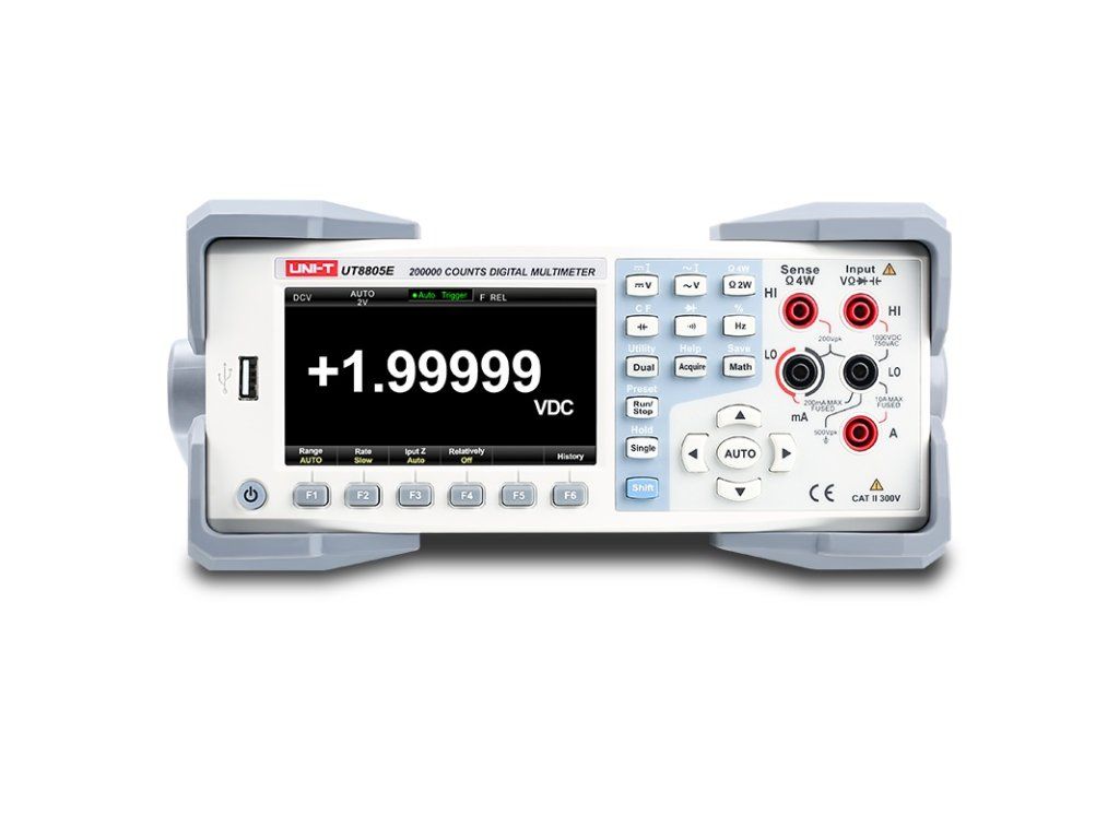 The UT8805E is a benchtop digital multimeter with a maximum display value of 199999 with automatic or optional manual range adjustment, color display and true RMS measurement function. Its circuit design utilizes large scale (LSI) analog-to-digital (A/D) converters, a microprocessor, multi-function measurement and highly stable thin film resistor technology, making it a digital multimeter with excellent performance. The instrument can be used to measure AC/DC voltage, AC/DC current, resistance, capacitance, temperature, frequency, pulse width, diode testing and circuit continuity, etc. In addition, it also has data retention function, maximum/minimum/mean value measurement, measurement with comparison function, relative value measurement, peak detection, trend graph capture and the ability to record/read up to 10,000 data records. The UT8805E comes with a 4.3-inch TFT color display with 480 x 272 pixel resolution, allowing for versatile and clear display of measurement results using bar graph readings or trend graphs. The display allows dual display of data, e.g. when measuring AC voltages or currents it also displays frequency, when measuring temperature it also displays thermocouple resistance, etc. It is a high-end electrical measuring instrument suitable for measurements in electronics, communications, manufacturing, national defense, electric power, chemical and other industries. This instrument strictly complies with the safety standards of IEC61010-1, EN61010-2-030, pollution level II, CATI 1000V overvoltage, CAT II 300V, it is double insulated, waterproof and dustproof with IP65 protection. It is an indispensable experimental tool for various colleges. - Display type: TFT-LCD with 4.3" diagonal and 480 x 272 px resolution - Number of display positions: 200,000 - Measurement speed: 5000 rdgs/s (2.5 reads/s; 10 reads/s; 5000 reads/s) - Dual display: yes, simultaneous display of two quantities - Circuit continuity test and diode test: yes - Temperature measurement: with built-in thermocouple with cold end compensation - Temperature measurement with external thermocouple: yes, preset conversions for ITS-90, Pt100 and Pt385 and thermocouple types B, E, J, K, N, R, S, T - Various mathematical operations: maximum, minimum, average value, standard deviation, pass/fail, dBm, dB, relative measurement, histogram, trend graph, bar graph - Supports USB, GPIB, RS-232C and LAN interfaces, USB-TMC, IEEE 488.2 standard, VXI11 and SCPI language - Compatible with the latest SCPI command set for mainstream multimeter - Historical data recording and storage - Ability to save data and configure settings to a USB drive - 1GB NAND FLASH storage, large capacity memory system and test data - English and Chinese menus and online help system - PC supervisor software - Wide power supply voltage range TECHNICAL SPECIFICATIONS: - DC voltage measurement: ranges 200mV to 1000V - DC current measurement: ranges 200µA to 10A - AC True-RMS voltage measurement: ranges 200mV to 750V - AC True-RMS Current Measurement: 2mA to 10A ranges - Resistance measurement: ranges 200Ohm to 100MOhm (optional 2- and 4-wire resistance measurement) - Capacitance measurement: 2nF to 2000µF ranges - Frequency range: 20Hz to 1MHz, AC True-RMS voltage/current 20Hz to 100kHz - 10A input terminal protection: (CE) F1, internal 10A /250V slow fuse - Input terminal protection µA, mA: (CE) F2, 250mA/250V fast fuse on rear panel - TFT 4.3" color display: dual, full icon display; 200000 max, 480 x 272pixels - Range selection: automatic or manual - Polarity display: automatic - Mathematical operations: pass/fail, relative, min/max/average, standard deviation, dBm, dB, hold, histogram, trend graph, bar graph General characteristics and mechanical properties : - power: AC 90V-110V, 45-440Hz; AC 110V-132V, 45-440Hz; AC 200V-240V, 45-66Hz; AC 216V-264V, 45-66Hz - power consumption: max. 20W - operating environment: 0°C to 28°C<90%; 28°C to 40°C<75%; 40°C to 55°C<50% (non-condensing) - altitude: ?2000 m - dimensions: 260 mm x 116 mm x 332 mm - weight: 4.4 kg - colour: grey and white Contents of individual packing : - uT8805E desktop multimeter 1pc - 3-core power cord 1pc - test leads 1 pair - USB connection cable 1pc - rS232 connection cable 1pc - uT8805E Quick Guide 1pc - uT8805E warranty card 1pc - computer software for PC 1 setAdditional parameters