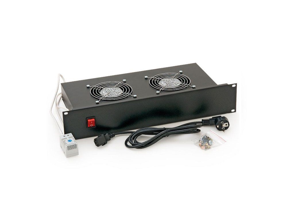 19" 2U horizontal fans with two 230V/30W fans (with thermostat and thermostat holder). Specifications: height: 2U placement: horizontal fan: 2 x thermostat: yes cable type: 3x1,5mm color: black power consumption: 30 W power supply: 100- 240V Package: screw m6 x 10: 4pcs Plastic washer: 4pcs Floating nut m6: 4pcsAdditional parameters