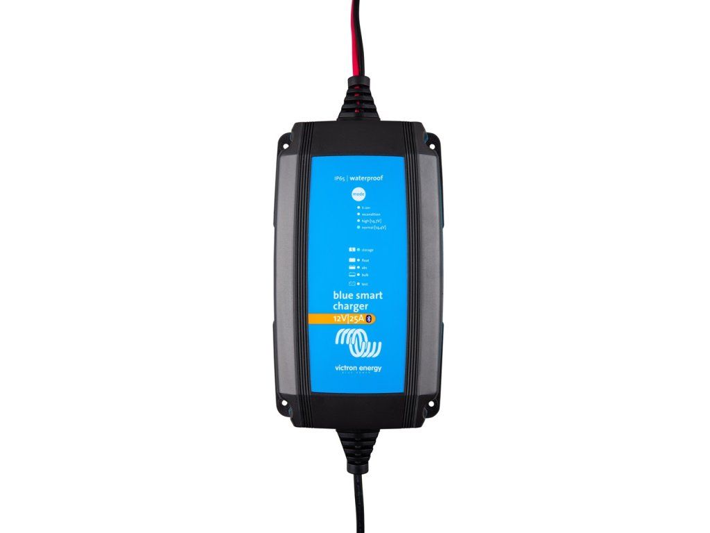 Optimal for 100-265Ah batteries Built-in Bluetooth technology for setting, displaying voltage and current Dust, water and chemical resistant Intelligent seven-step charging algorithm Recovering a fully discharged "dead" battery Automatic power supply function Resistant to low temperatures down to -30°C Several additional features to increase battery life Low power mode for charging small batteries Special mode for charging Li-ion batteries Bluetooth You can set up, view and configure the Blue Smart IP65 charger via your smartphone. You can view the charger and battery status. Even control the charger's functions using the VictronConnect app. The screen displays the default voltage and current value. You can also download the VictronConnect app for free on Google Play or in the App Store. Regeneration A lead-acid battery that has been undercharged or left discharged for days or weeks will deteriorate due to sulfation. If detected early, sulfation can sometimes be partially reversed by charging at a low current until the battery reaches a higher voltage. Recovery function for fully discharged batteries Most surge-protected chargers will not recognise batteries discharged to zero or near-zero voltage and therefore will not start charging them. However, the Blue Power Charger will attempt to recharge even a fully discharged battery with low current, resuming normal charging as soon as sufficient voltage is present at the battery terminals. The ultra-efficient "green" battery charger At up to 95% efficiency, these chargers produce up to 4 times less heat than the industry standard. When the battery is fully charged, power consumption is reduced to 0.5W, which is 5 to 10 times better than the standard. Long life, safety and quiet operation - Low temperature load on electronic components. - Protection against the ingress of dust, water and chemicals. - Overheating protection: the output current will decrease as the temperature rises up to 60°C, but the charger will not fail. - The chargers are completely silent: they do not contain an active heat sink (fan) or other moving parts. Storage mode: less corrosion of positive electrodes Even a lower holding charge voltage following the absorption phase can cause grid corrosion. It is therefore imperative to continue to reduce the charging voltage if the battery remains connected to the charger for more than 48 hours. Charging with temperature compensation The optimum charging voltage for a lead acid battery is the inverse of its temperature. The Blue Power IP65 Charger measures the ambient temperature during the test phase and compensates for it during charging. The temperature is measured again when the charger is in low current mode during maintenance or storage. Therefore, no special setting is needed for cold or hot environments. Charging mode for Li-ion batteries The Blue Power Charger uses a special charging algorithm for Li-ion (LiFePO4) batteries, with automatic reset to protect under-voltage Li-ion batteries. Normal charging voltage mode 14,4V- suitable for gel and AGM batteries. High charging voltage mode 14.7V - suitable for open topped liquid batteries. Package contents: 1x Victron charger 1x Supply cables with M8 eyelets 1x Lead cables with M8 M8 clips Technical data: - Input voltage: 180 - 265 V AC - Frequency: 45 - 65 Hz - Charging current: 25 A - No-load power consumption: 0.5 W - Absorption charging voltage: 14.4 V - Maintenance charging voltage: 13.8 V - Storage mode voltage: 13.2 V - Protections: output reverse polarity, output short circuit, overheating - Operating temperature range: - 30 to + 50 °C - Humidity: maximum 95% - Battery output: 1.5 m black and red cable - 230 V AC charger input: 1.5 m cable with conventional plug - Degree of protection: IP 65 - Plug type: CEE7/7 (Schuko) - Weight: 0.9 kg - Dimensions (height x width x length): 75 x 140 x 240 mmAdditional parameters