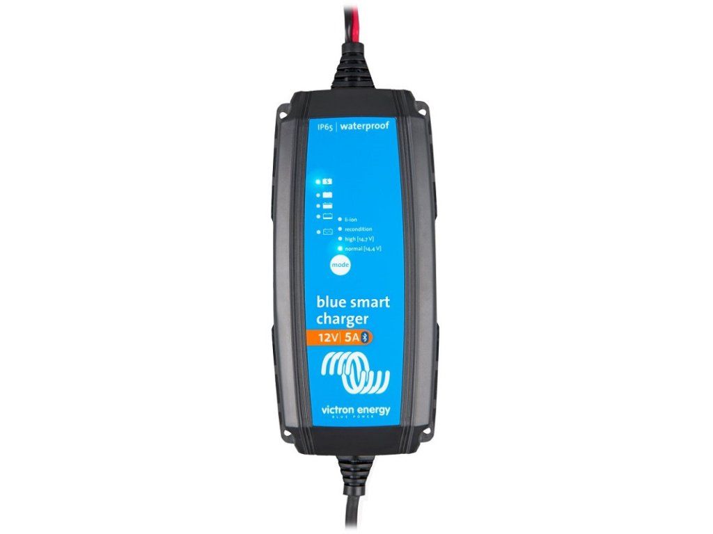 Optimal for batteries with a capacity of 20-40Ah. -Built-in Bluetooth technology to adjust, display voltage and current -Dust, water and chemical resistance -Intelligent seven-step charging algorithm -Recovering a fully discharged "dead" battery -Automatic power supply function -Resistant to low temperatures down to -40°C -Several additional features to increase battery life -Low power mode for charging small batteries -Special mode for charging Li-ion batteries -5 year warranty Bluetooth You can set up, view and configure the Blue Smart IP65 charger via your smartphone. You can view the charger and battery status. Even control the charger's functions using the VictronConnect app. The screen displays the default voltage and current value. You can download the app for iOS and Android here. You can also download the VictronConnect app for free on Google Play or in the App Store. The app is not yet available for Windows mobile phones. Regeneration A lead-acid battery that has been undercharged or left discharged for days or weeks will deteriorate due to sulphation. If detected early, sulfation can sometimes be partially reversed by charging at a low current until the battery reaches a higher voltage. Recovery function for fully discharged batteries Most surge-protected chargers will not recognise batteries discharged to zero or near-zero voltage and therefore will not start charging them. However, the Blue Power Charger will attempt to recharge even a fully discharged battery with low current, resuming normal charging as soon as sufficient voltage is present at the battery terminals. The ultra-efficient "green" battery charger At up to 95% efficiency, these chargers produce up to 4 times less heat than the industry standard. When the battery is fully charged, power consumption is reduced to 0.5W, which is 5 to 10 times better than the standard. Long life, safety and quiet operation -Low temperature load on electronic components. -Protection against the ingress of dust, water and chemicals. -Overheating protection: the output current will decrease as the temperature rises up to 60°C, but the charger will not fail. -The chargers are completely silent: they do not contain an active heat sink (fan) or other moving parts. Storage mode: less corrosion of positive electrodes Even a lower holding charge voltage following the absorption phase can cause grid corrosion. It is therefore imperative to continue to reduce the charging voltage if the battery remains connected to the charger for more than 48 hours. Charging with temperature compensation The optimum charging voltage for a lead acid battery is the inverse of its temperature. The Blue Power IP65 Charger measures the ambient temperature during the test phase and compensates for it during charging. The temperature is measured again when the charger is in low current mode during maintenance or storage. Therefore, no special setting is needed for cold or hot environments. Charging mode for Li-ion batteries The Blue Power Charger uses a special charging algorithm for Li-ion (LiFePO4) batteries, with automatic reset to protect under-voltage Li-ion batteries. Normal charging voltage mode 14,4V- suitable for gel and AGM batteries. High charging voltage mode 14.7V - suitable for open topped liquid batteries. Package contents: 1x Victron charger 1x Supply cables with M8 eyelets 1x Lead cables with M8 M8 clips Technical data: Input voltage: 180 - 265 V AC Frequency: 45 - 65 Hz Charging current: 5 A No-load power consumption: 0.5 W Absorption charging voltage: 14.4 V Maintenance charging voltage: 13.8 V Storage mode voltage: 13.2 V Protections: output reverse polarity, output short circuit, overheating Operating temperature range: - 30 to + 50 °C Humidity: maximum 95% Battery output: 1.5 m black and red cable 230 V AC charger input: 1.5 m cable with conventional plug Degree of protection: IP 65 Plug type: CEE7/7 (Schuko) Weight: 0.9 kg Dimensions (height x width x length): 45 x 81 x 182 mmAdditional parameters