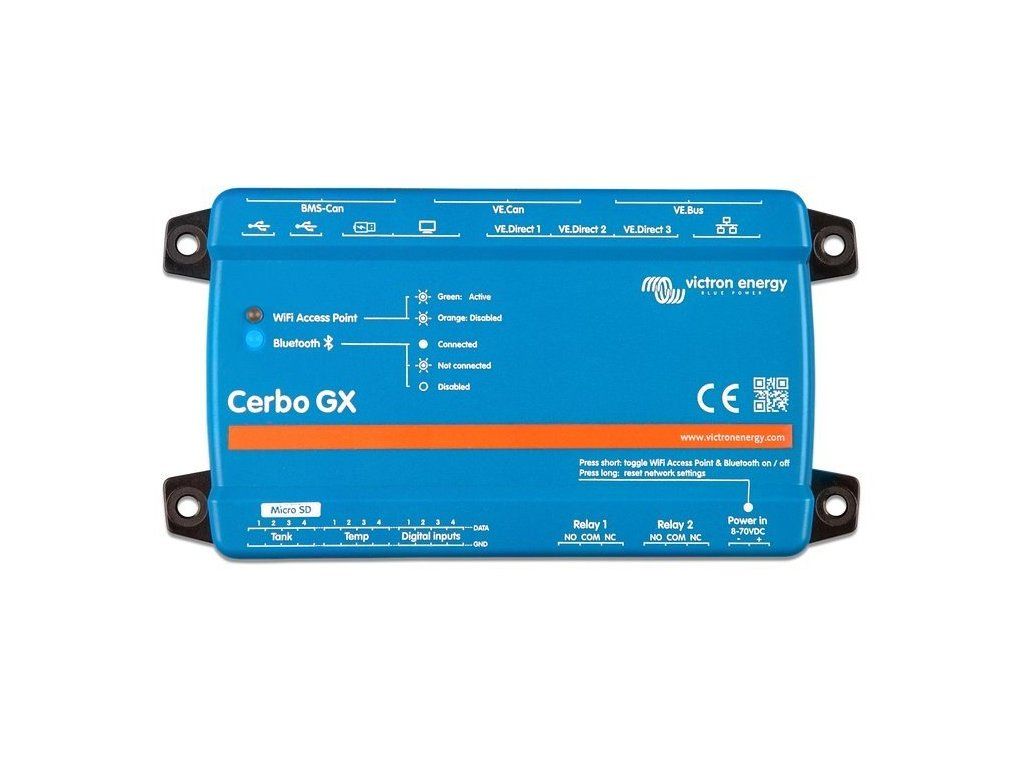 The Cerbo GX MKII communication centre allows you to safely control your solar system from anywhere and maximise its performance. Main differences between Cerbo GX and Cerbo GX MKII - Two fully functional CAN bus ports - VE.Can 1 and VE.Can 2 (Cerbo GX has one VE.Can port and one BMS-Can port), VE.Can 1 is isolated - RJ-45 connectors have been rotated 180° for easier cable handling - All three USB ports are active and can be used for power (only one is active in the original version) - Digital inputs can perform pulse counting Monitoring of the solar panels and the entire system This innovative communication center allows you to safely manage your solar system from anywhere and maximize its performance. Easily connect via the Victron Remote Management (VRM) portal or gain direct access via the standalone GX Touch 50 display, Multi-Function Display (MFD) or the VictronConnect app via Bluetooth. This new addition to the GX Series combines all the best features of connectivity to bring intelligent power system solutions in a whole new light. Perfect monitoring and control Easily monitor battery charge status, energy consumption, energy gains from PV panels, generator or distribution grid. Check tank levels, measured temperature, input current limits, generator(s) (auto) start/stop or optimize system operation by changing any settings. Respond to warnings, perform diagnostic tests and resolve emerging issues remotely. With Cerbo GX, all the challenges of controlling a power system are a breeze. Maximize system performance Cerbo GX maximises the performance of power system components in real time and perfectly adjusts the entire system. With a 2-core processor and CAN bus port, you can now support even larger systems and also monitor controlled (lithium) batteries, while a second port can support up to 25 simultaneously connected VE.Can solar controllers. With new NMEA 2000-out support, GX devices can be easily integrated into any ship's network. Four ports for tanks, four ports for temperature measurements along with 3 VE.Direct ports, 3 USB ports, 4 digital inputs and 2 relays take control options to a new level. Maximizing the performance of the entire power system is easier than ever. Expand your overview The new 5" GX Touch 50 touchscreen (optional accessory) allows you to have an instant overview of your entire system and quickly change settings as needed. With its slim, waterproof design, easy mounting directly on the dashboard and easy installation, it provides great flexibility. Easy to install and configure The Cerbo GX is now optimized to meet and even exceed the installation requirements of professionals. The device is easily mounted on a DIN support rail (using the DIN35 adapter, not included) and its standalone touchscreen can be screwed directly onto the dashboard, so there is no need to cut a suitable hole (as was the case with the Color Control GX), plus the device connects with just one cable, meaning you no longer need to pull multiple cables to the dashboard. The new Bluetooth feature allows for quick connection and configuration via our VictronConnect app. Handle any challenge The Cerbo GX can serve a plethora of purposes and delivers the ultimate control for a variety of applications. For systems involving generators, such as marine or backup systems and off-grid, it automatically starts/stops the generator or delays ignition until the end of the "quiet" period. In the case of energy storage, it keeps backup batteries charged to 100%, kicks in during power outages and diverts excess (solar) energy to self-consumption, saving you money. For emergency vehicles, it guarantees flawless operation of all important energy systems. BASIC SPECIFICATIONS Supply voltage: DC 8-70 V Interfaces: Wi-Fi, Bluetooth, 1× RJ-45, 3× VE.Direct, 1× HDMI, 3× USB, 2× VE.Bus, 2× VE.Can, 2× BMS-Can, 12× I/O port, 2× relay, 1× microSD slot Dimensions: 154 × 78 × 48 mmAdditional parameters