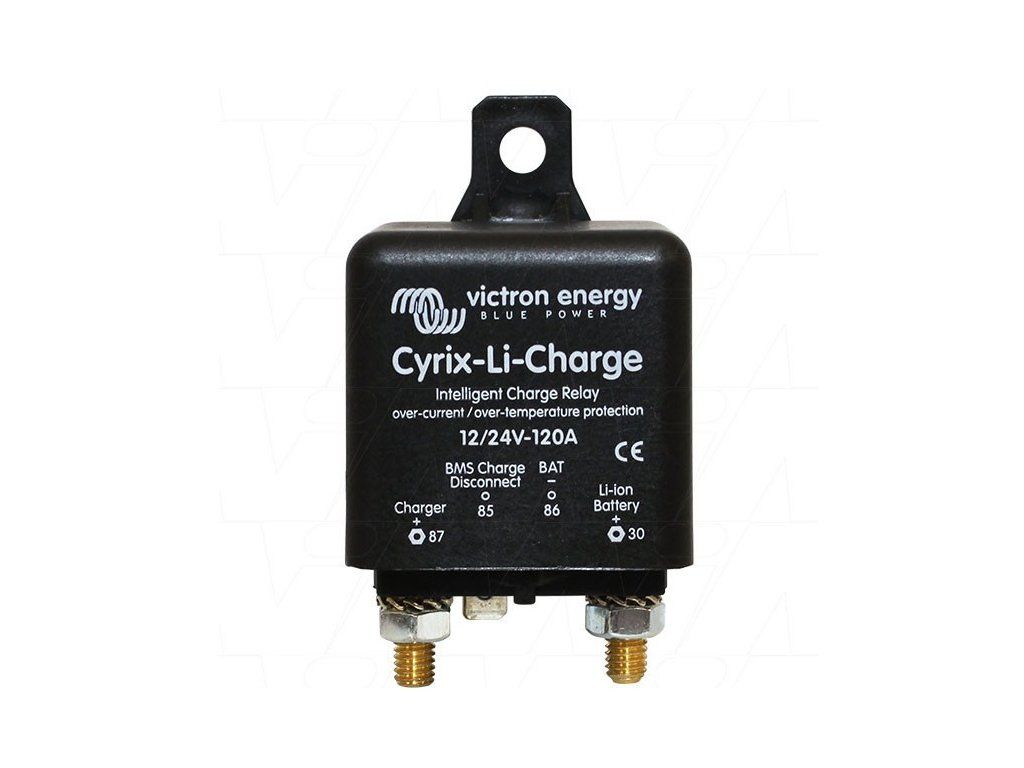 Victron Energy Cyrix-Li-Charge 12/24V 120A Battery Connector The Cyrix battery interconnect is a microprocessor controlled power relay that automatically connects batteries in parallel when one battery has reached a preset voltage (indicating that the battery is charging) and disconnects batteries when the voltage drops below the float voltage (indicating that one or more batteries are discharged). Cyrix battery isolators are a good replacement for Argo Diodes. Their main advantage is that they show virtually no voltage drop and therefore the output voltage of charging alternators or battery chargers does not need to be increased. Cyrix-Li-Charge connects the battery charger with a 3 second delay: if the control input is supplied by the BMS and at the same time if the charger contact is more than 13.7V (or 27.4V or 54.8V), if there is more than 2V on the battery contact (the Cyrix remains open until it is connected to the battery). The Cyrix-Li-Charge will shut down immediately whenever there is no power at its control input from the BMS, due to overvoltage or overheating of the battery cell. Generally, the cell overvoltage alarm resets shortly after charging is stopped. The Cyrix will then reconnect the charger after 3 seconds. After two attempts, the 3 second delay is extended to 10 minutes. If the battery voltage is less than 13.5V (or 27V or 54V), the Cyrix will disconnect with a delay of 1 hour. Note 1: In the case of zero discharge current or low discharge current, the Cyrix will not disconnect shortly after the charger is turned off or disconnected because the battery voltage will remain higher than 13.5V. Note 2: If the charger output immediately rises to 13.7V or more after the Cyrix is disconnected, the Cyrix will turn back on with a 3 second delay. Product Parameters: Current 120 A Voltage 12 V Voltage 24 VAdditional parameters