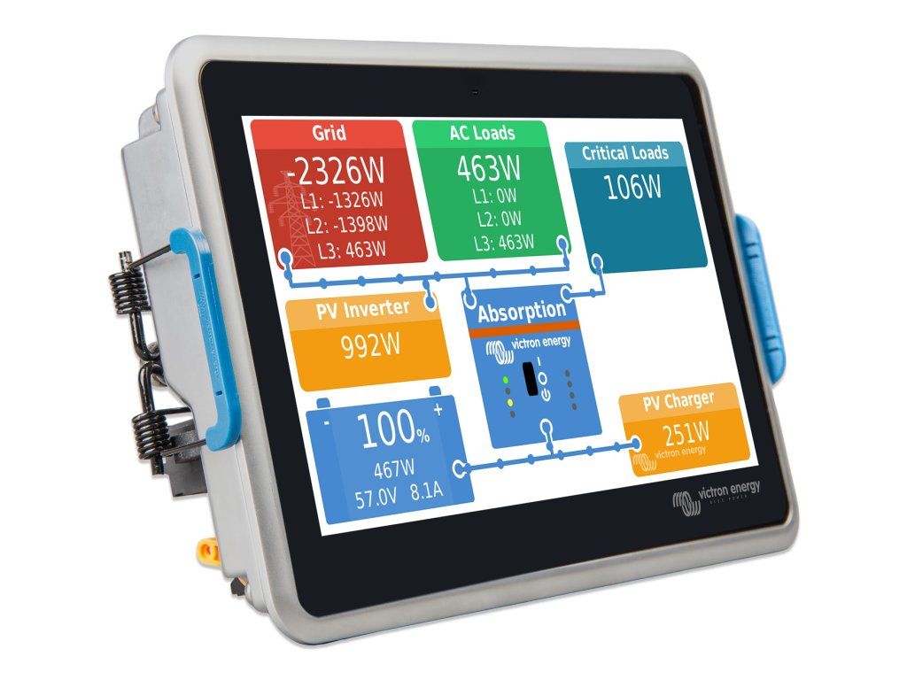 Communication center, for solar system, Wi-Fi, Bluetooth, LAN, VE.Direct, VE.Bus, VE.Can, USB, I/O, relay, microSD slot Ekrano GX represents the next generation in the GX product family. With its full range of connections and interfaces, as well as a built-in 7" touchscreen, it is the most powerful GX device to date, allowing you to always have perfect control of your system wherever you are and maximize its performance. Easily access your system through the Victron Remote Management (VRM) portal, using the built-in touchscreen, multi-function display (MFD) or VictronConnect app and integrated Bluetooth and Wi-Fi connectivity. Ekrano GX is also the successor to Color Control GX. Built-in 7" touchscreen the 7" touchscreen provides an instant overview of your system and allows you to adjust settings. The touch function can be disabled (or enabled) via a recessed button on the back to prevent unauthorized use. Brightness can be adjusted manually or automatically thanks to the built-in ambient light sensor. When mounted using the supplied steel bracket, the display is externally waterproof (IP54). Remote Console on VRM Monitor, control and configure the Ekrano GX remotely over the Internet just as if you were standing in front of the device. The same features are also available via a local LAN or built-in Wi-Fi access point. Perfect monitoring and control Instantly monitor battery charge status, energy consumption, PV, generator and grid power generation or check tank levels and temperature readings. Easily control the shore power input current, (automatic) start/stop of generators or change any settings to optimize the system. Monitor alerts, perform diagnostic checks and troubleshoot remotely. Easy installation and configuration The Ekrano GX is easy to install using the panel mounting cutout and includes a steel bracket and springs for blind hole mounting. All ports are easily accessible from the rear. The power and relay terminals can be screwed into place and the IO terminal block has quick release terminals for easy access. A Bluetooth interface allows for quick connection and configuration via the VictronConnect app. Specifications: 7" diagonal Resolution: 1024 × 600 px Interfaces: Wi-Fi, Bluetooth, 1× RJ-45 (Ethernet), 2× USB (type A), 3× VE.Direct, 2× VE.Can, 1× VE.Bus, 2× relay, 1× microSD slot, 2× digital input, 3× tank level sensor input, 2× temperature sensing sensor input Supply voltage: DC 8-70 V Coverage: front side: IP54 (when installed with steel bracket), IP31 (when installed with springs) rear side: IP21 Dimensions: 187 × 124 × 29.8 mmAdditional parameters
