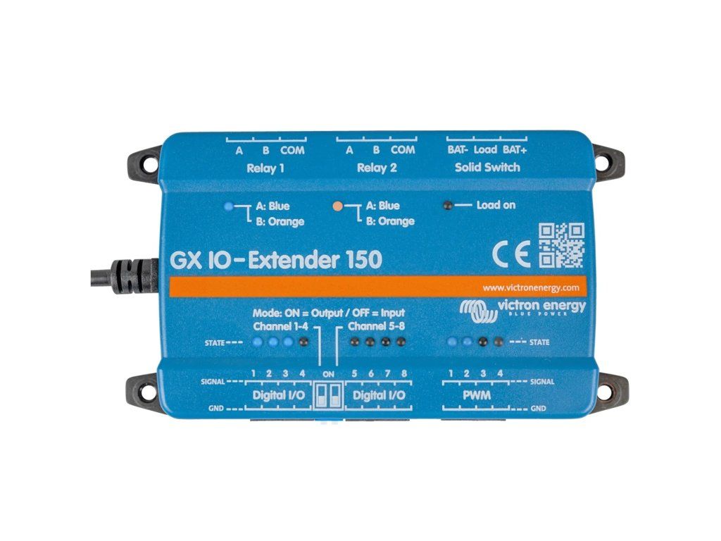 The Victron Energy GX IO-Extender 150 is an intelligent expansion module designed to expand the input and output capabilities of GX devices. It connects via USB, which also provides power, and provides an easy way to integrate additional sensors, switches and controls. The module can be configured via Node-RED directly in the GX device or via switches in the Switch strip of the user interface. Main features and functions: - 8 digital I/O: Each I/O is optionally configurable as input or output (including LED status indication). - PWM outputs: 4 channels for precision control with 5 V and 8 bit resolution at 1.5625 kHz. - Two bistable relays - for AC: 0.5 A at 250 V AC (125 VA), for DC: 0.3 A at 220 V DC (90 W). - Solid State Relay (SSR): For fast switching of DC loads and support of resistive, capacitive and inductive loads. - Pluggable spring terminals: Allow for fast and reliable wire installation. - Completely isolated circuits from USB for maximum connection safety. Specifications: - USB power supply (5 V, max. 200 mA) - Power consumption: < 100 mW (idle), max. 1 W - Digital I/O: 8x, 3.8-5.5 V (input), 5 V / 4 mA (output) - PWM outputs: 4 channels, 5 V, 8 bits @ 1.5625 kHz - Latching relay: 2x, DC: 3 A @ 30 V, AC: 2 A @ 60 V - Solid State Relay (SSR): max. 70 VDC, 4 A, max. capacitive load 1000 µF (up to 15 V), inductive load up to 1000 mH - Wall or DIN rail mounting (with accessories) - Dimensions: 123 x 67 x 23 mm - Weight: 0.17 kg - Operating temperature: -20 °C to +50 °CAdditional parameters