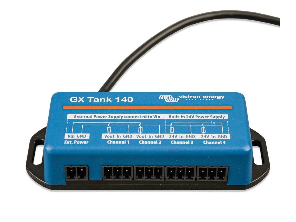 The GX Tank 140 takes readings from up to four tank level sensors. This is an accessory that is designed for our GX line of system monitoring products, of which the Cerbo GX is the most commonly used model. The tank level can be read locally on the system, see screenshot, or remotely via our VRM Portal. The GX Tank 140 is compatible with both current transmitters (4 to 20 mA) and voltage status transmitters (0 to 10 V). Connection to the GX device is via USB, which is also how the GX Tank is powered: no additional cabling is required. The tank's transmitter wiring is designed to be as simple as possible: two of the four inputs provide 24 V power for the transmitter. The other two channels require an external power supply and are equipped with fuse-protected terminals to make this easy. Upper and lower limits are configurable to allow the use of transmitters that provide only a portion of the scale, such as 0 to 5 V. To ensure a stable reading, the readings are averaged by damping. The damping can be set between 1 and 60 seconds. Faulty sensors and wiring problems have been detected: an alert is activated when readings are out of range. For marine applications, the GX can transmit these tank level readings over the NMEA 2000 network so that other displays, such as MFDs, can capture them.Additional parameters